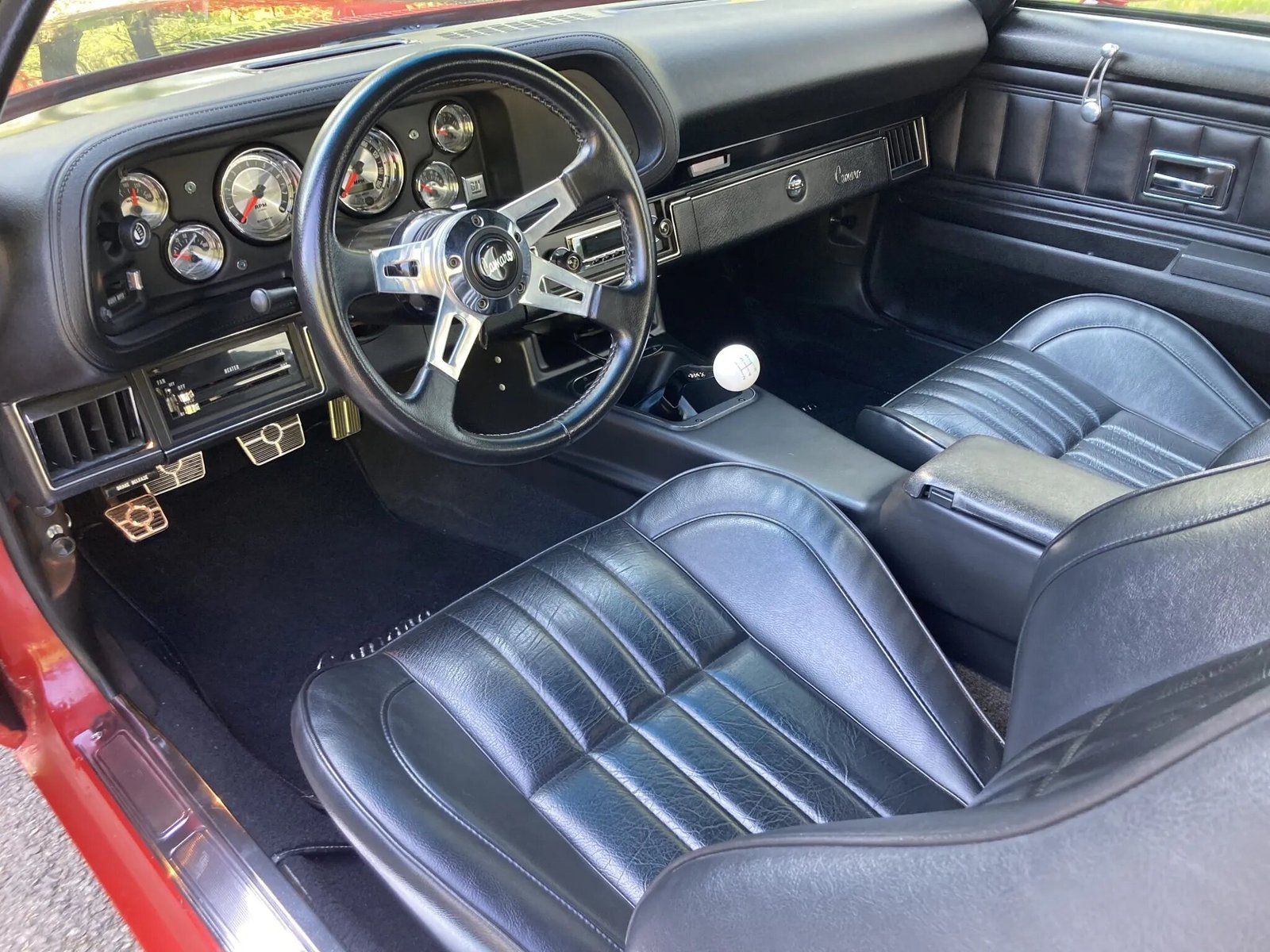 Additional appointments include hand-crank side windows, a Hurst shifter, and a RetroSound head unit.