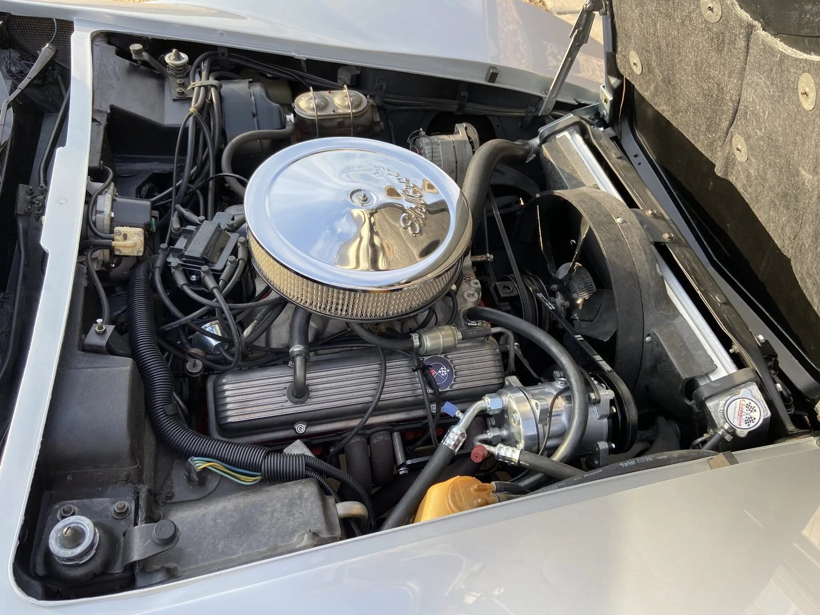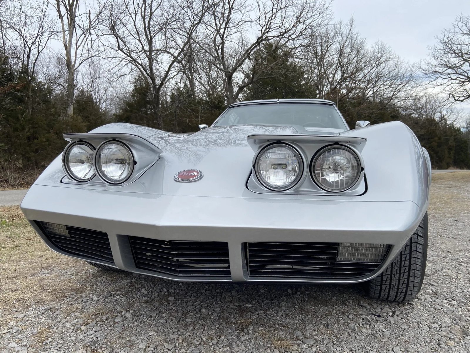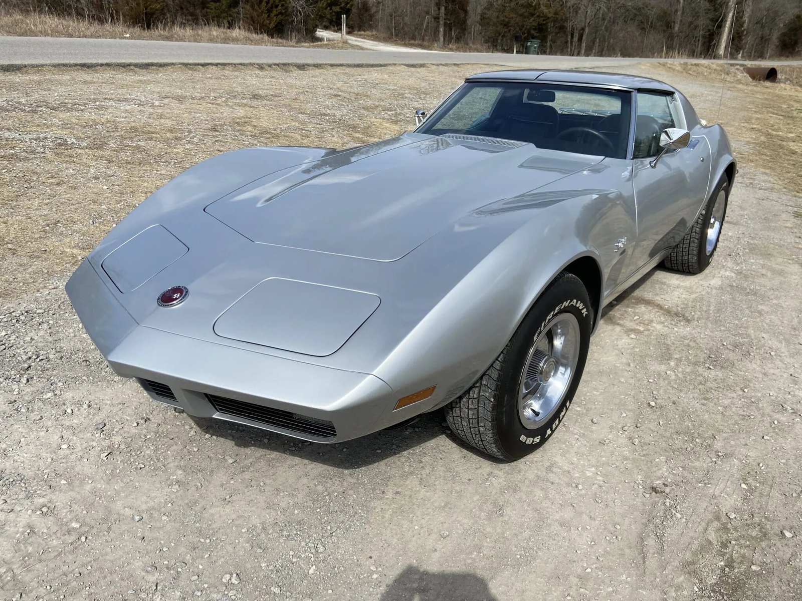 This 1973 Chevrolet Corvette coupe is finished in metallic silver over black and powered by a numbers-matching 350ci V8 paired with a three-speed TH400 automatic transmission.