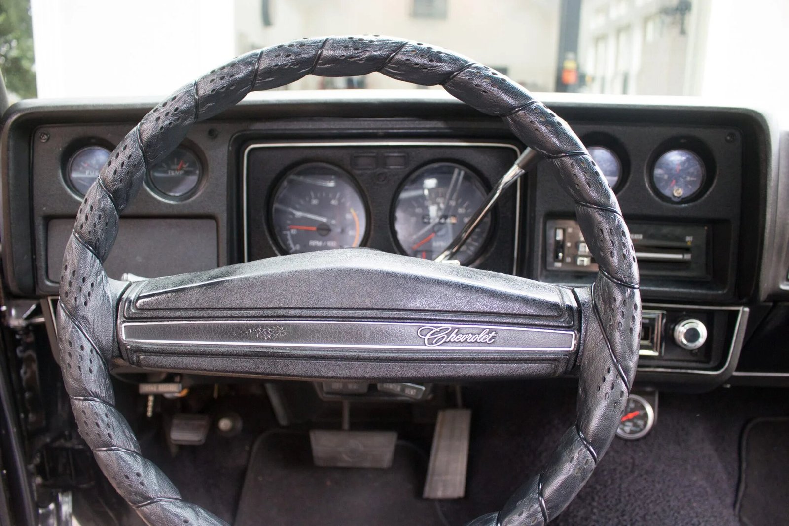 The two-spoke steering wheel on a tilt column is wrapped and fronts a 120-mph speedometer, a tachometer, a clock, and gauges for fuel level, coolant temperature, and amperage.