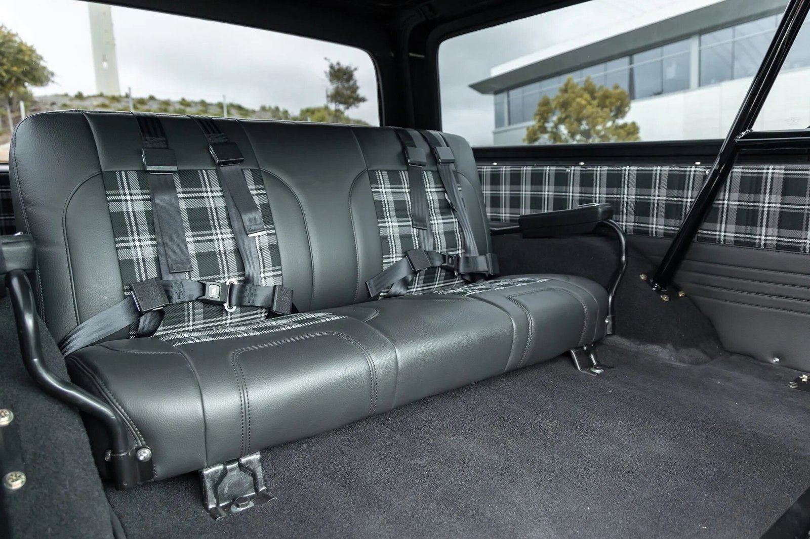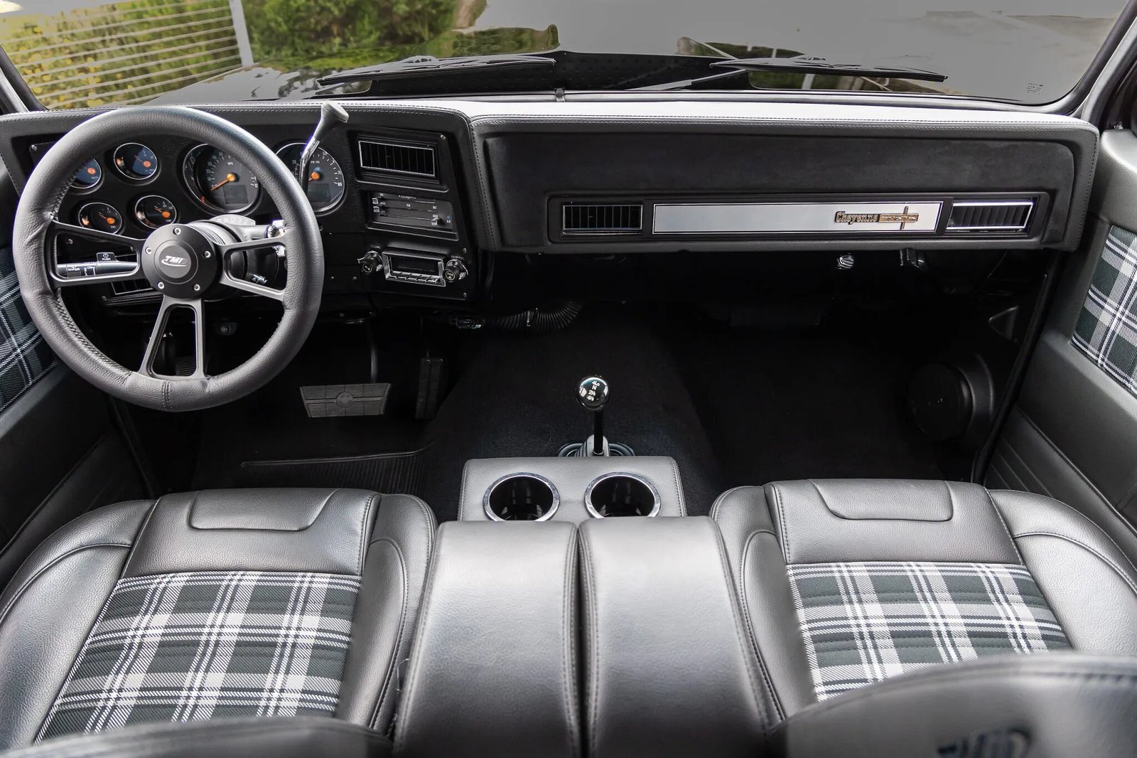 The cabin houses reclining TMI front bucket seats and a rear bench trimmed in black vinyl with tartan-pattern cloth as well as color-coordinated door and trim panels.