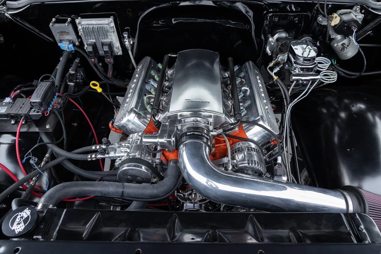 The 6.2-liter LS3 V8 was sourced from GM Performance and features a Holley Sniper electronic fuel injection system and Corvette-script aluminum valve covers.