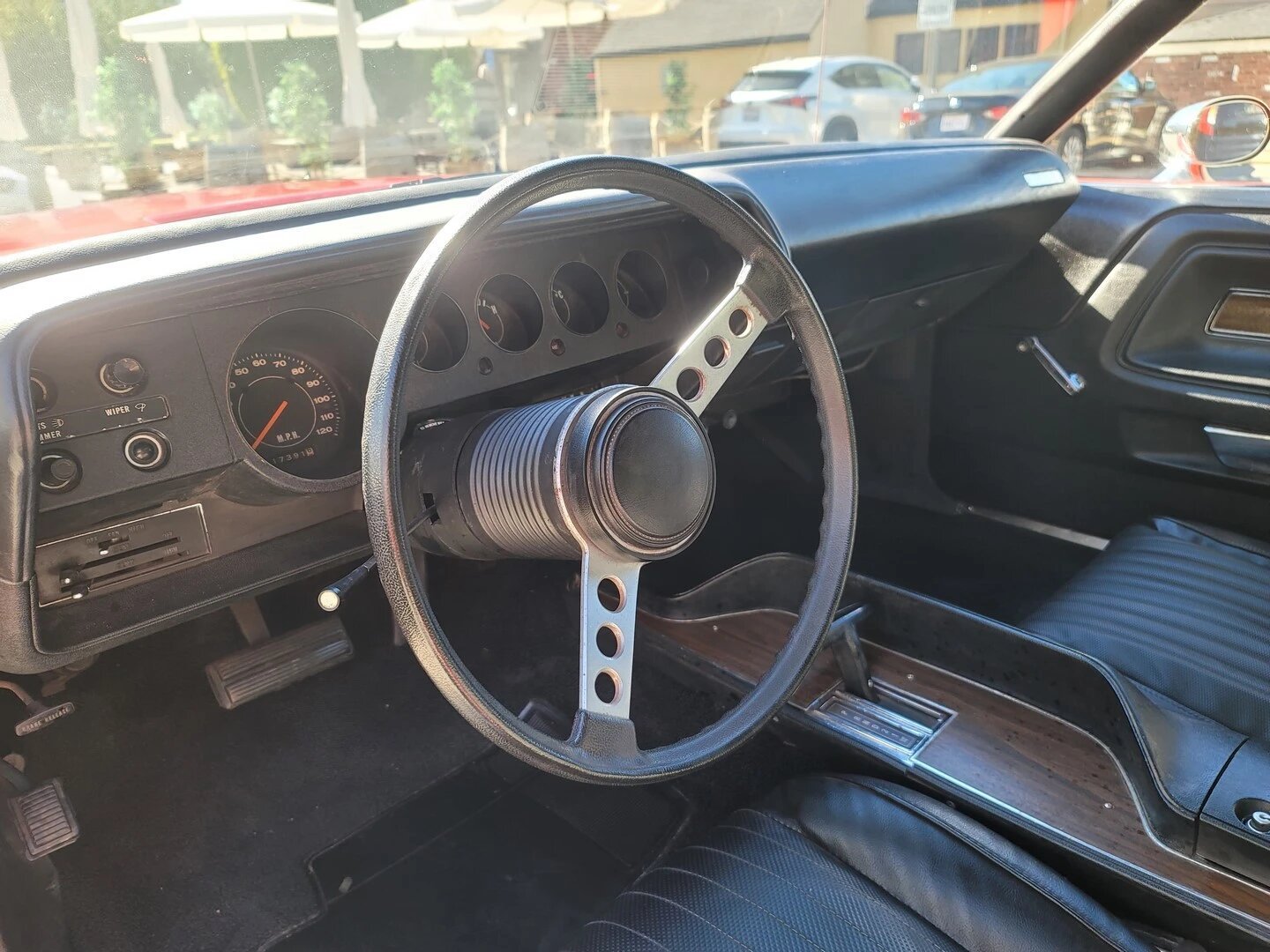 The two-spoke steering wheel frames a 120-mph speedometer and auxiliary gauges. The five-digit mechanical odometer shows 17k miles, total mileage is unknown.