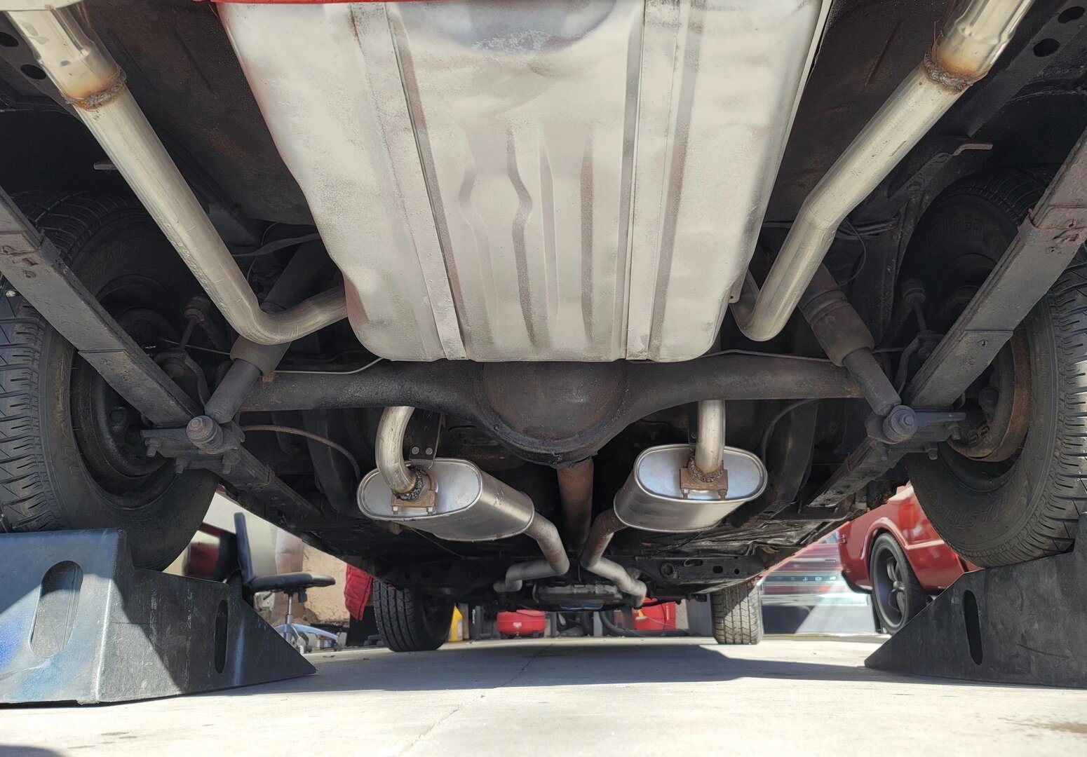 Equipment includes black side stripes, hood pins, dual chrome mirrors and bumpers, quad headlamps, a dual-outlet exhaust that exits below the rear valance, and a satin black tail panel.