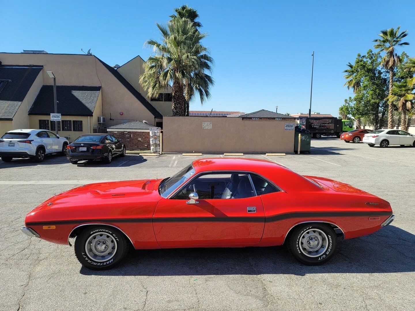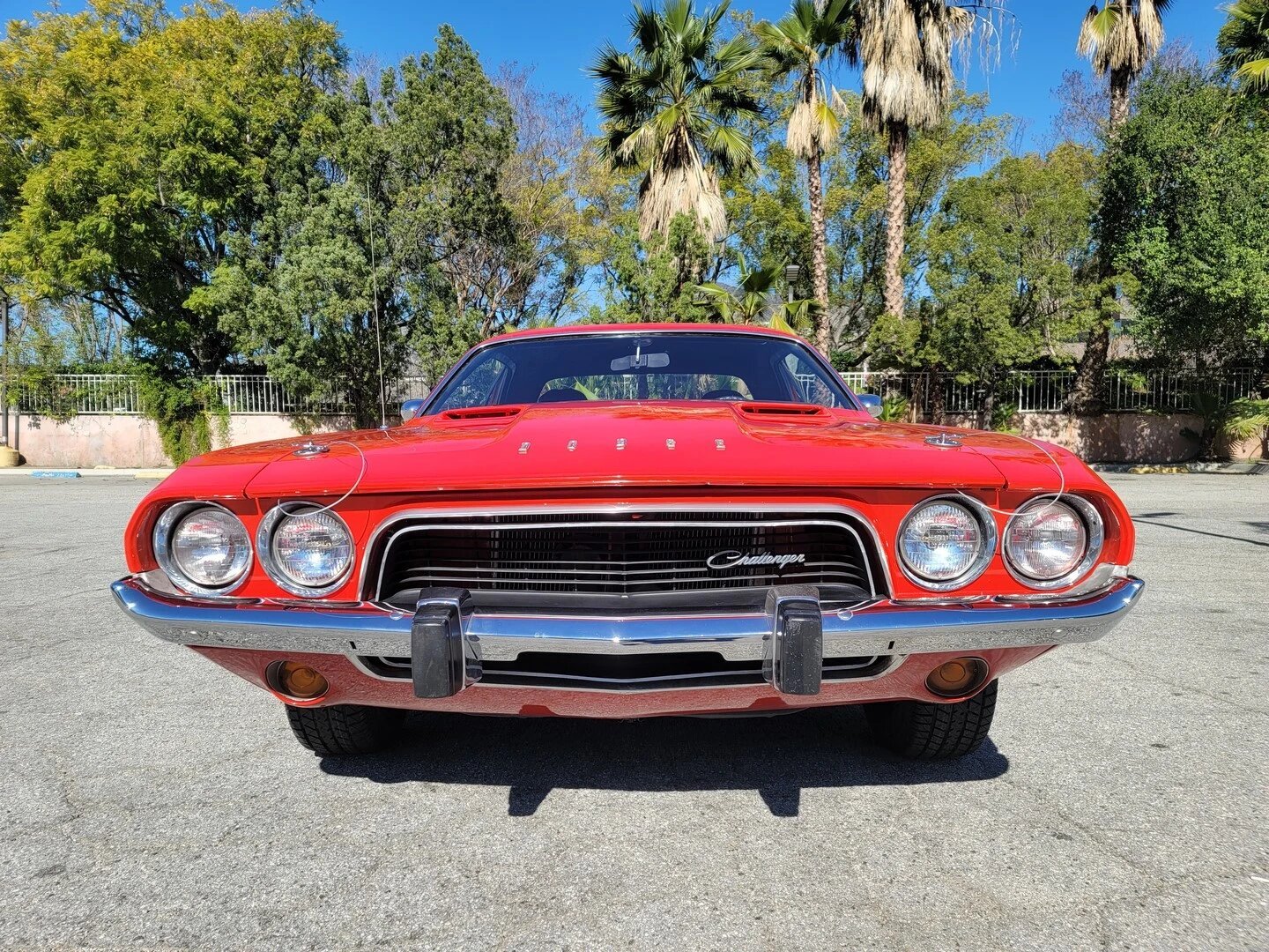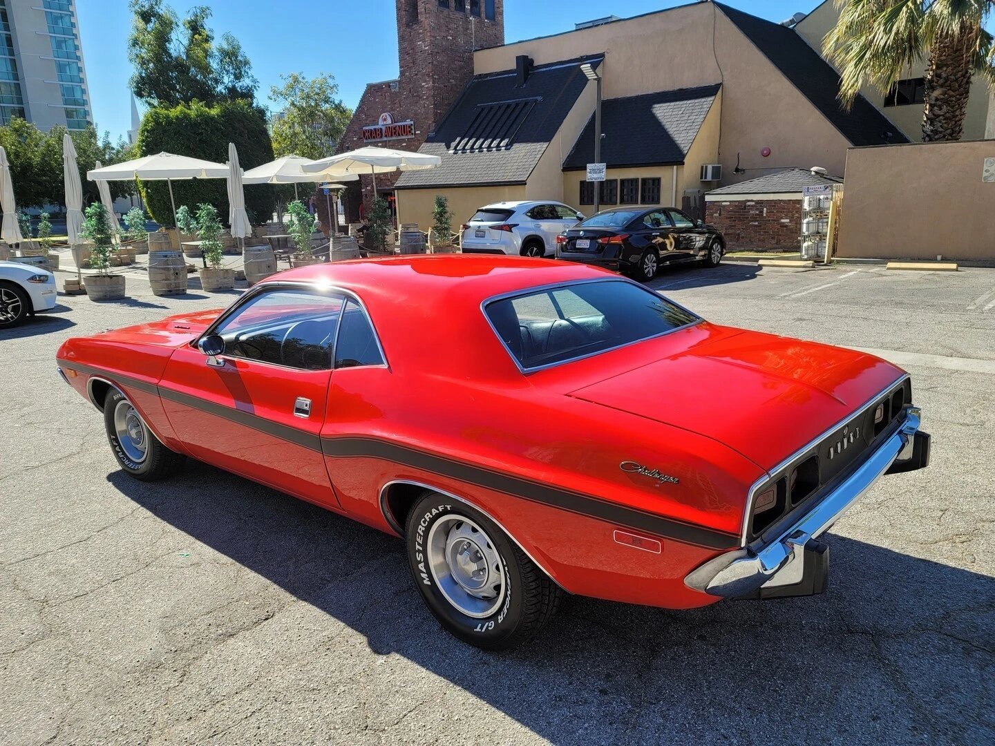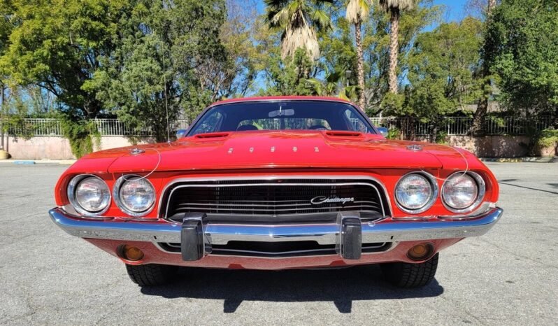 This 1973 Dodge Challenger is finished in red over black and powered by a 340ci V8 paired with a three-speed automatic transmission and 3.55:1 Positraction rear differential.