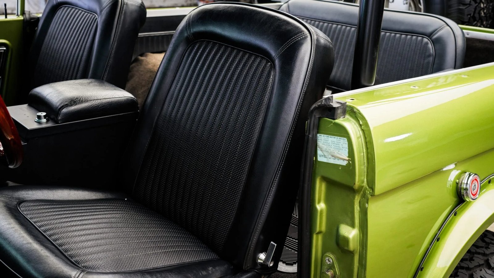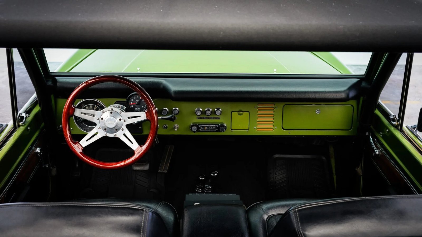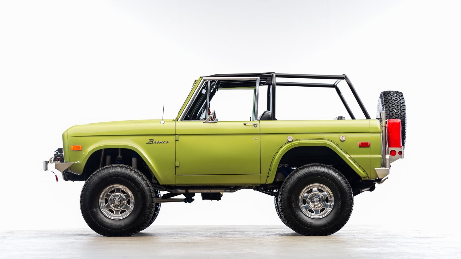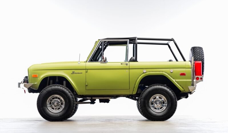 This 1973 Ford Bronco is a modified example that is finished in Limestone Green Metallic over a black interior and powered by a 351ci Windsor V8 paired with a three-speed automatic transmission and an Atlas dual-range transfer case. Equipment includes aftermarket bumpers, a black bikini top, a roll cage, 15″ Weld Racing wheels, power steering and brakes, a suspension lift, an air compressor and tank, ARB air locker front differential, a Currie rear axle assembly, Mile Marker hubs, and a twin-stick transfer-case shifter.