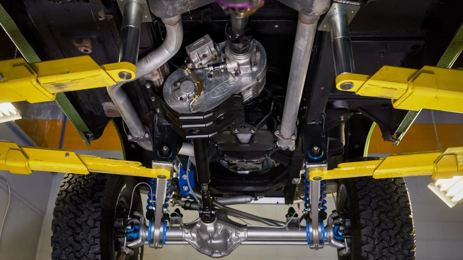 Power is sent to the rear or all four wheels through a three-speed automatic transmission, an Atlas dual-range transfer case, an ARB air locker front differential, Mile Marker front hubs, and a Currie rear axle assembly.