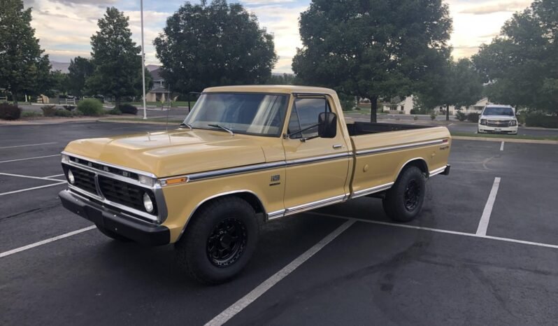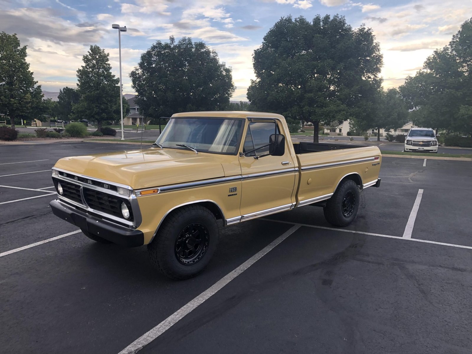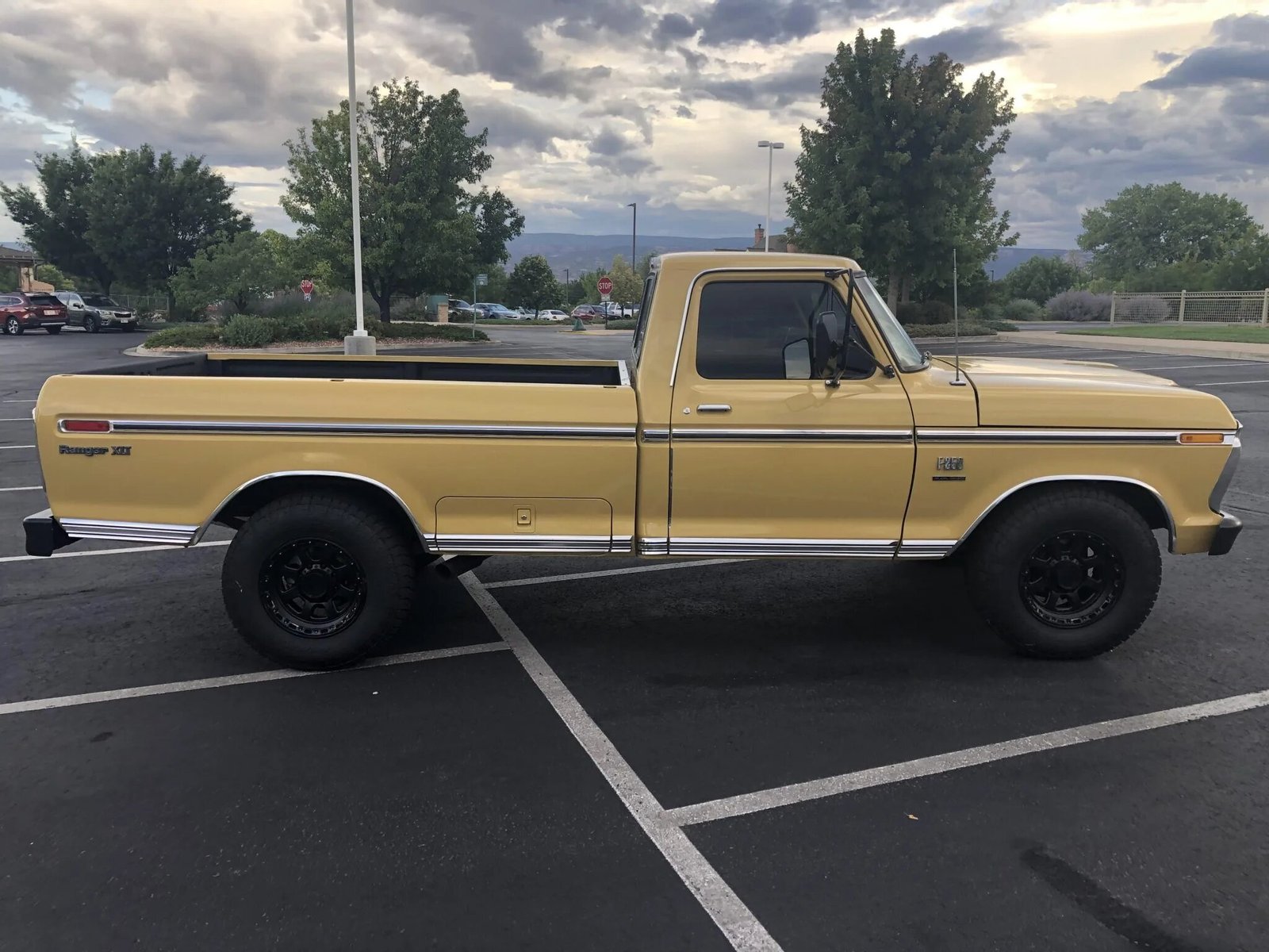 The truck is finished in Durango Tan (X) and features stainless body trim, tinted windows, western-style mirrors, a sliding rear window, dual side-exit exhaust outlets, and a locking storage compartment on the passenger-side of the bed.