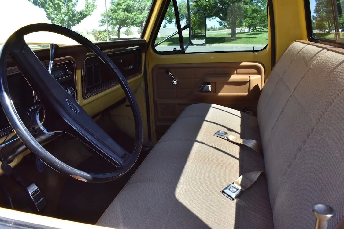 The cabin features a front bench seat trimmed in brown vinyl and cloth with a color-coordinated dash pad, door panels, and carpeting.