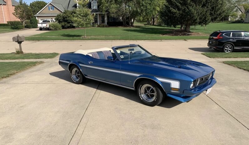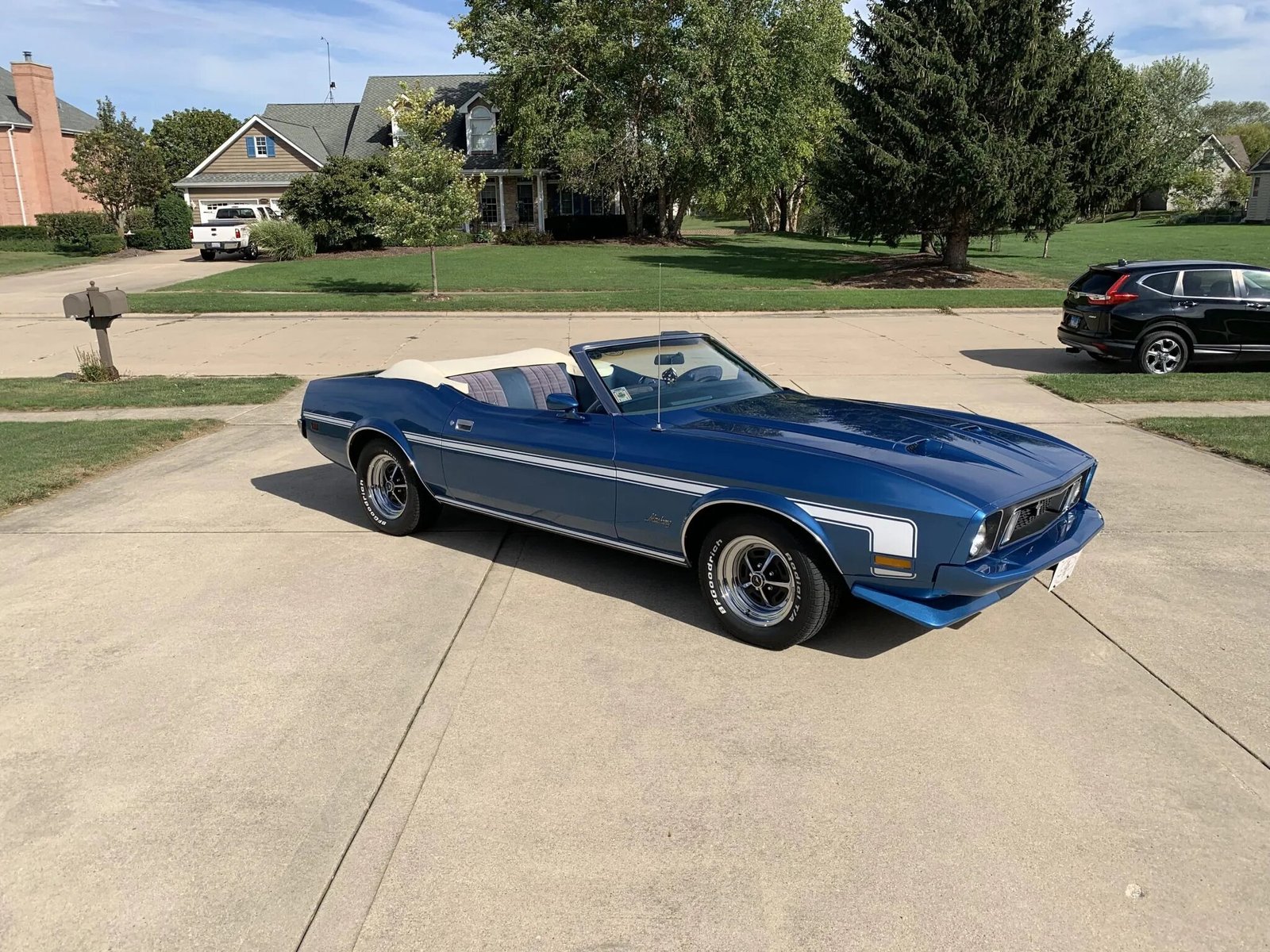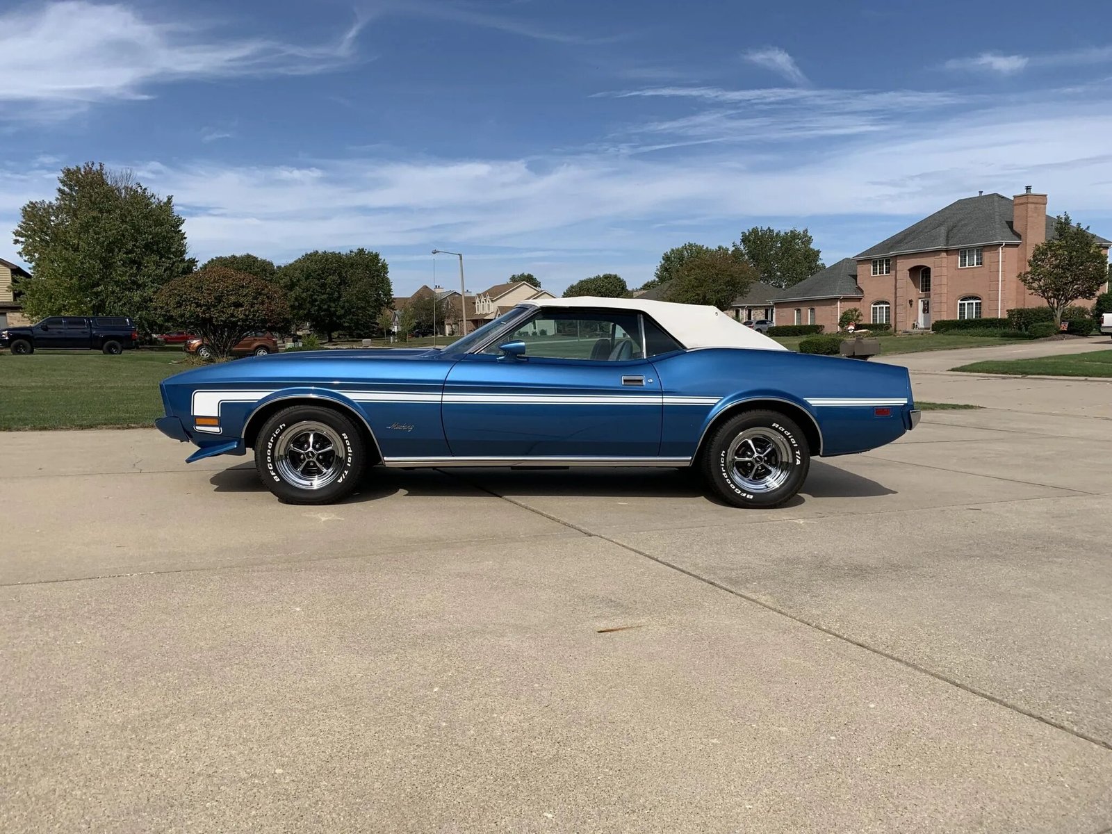 Features include a white power-operated soft top, white boot cover, a NACA Ram Air hood, a front spoiler, white Mach 1-style side stripes, body-colored mirror caps, and a chrome rear bumper.