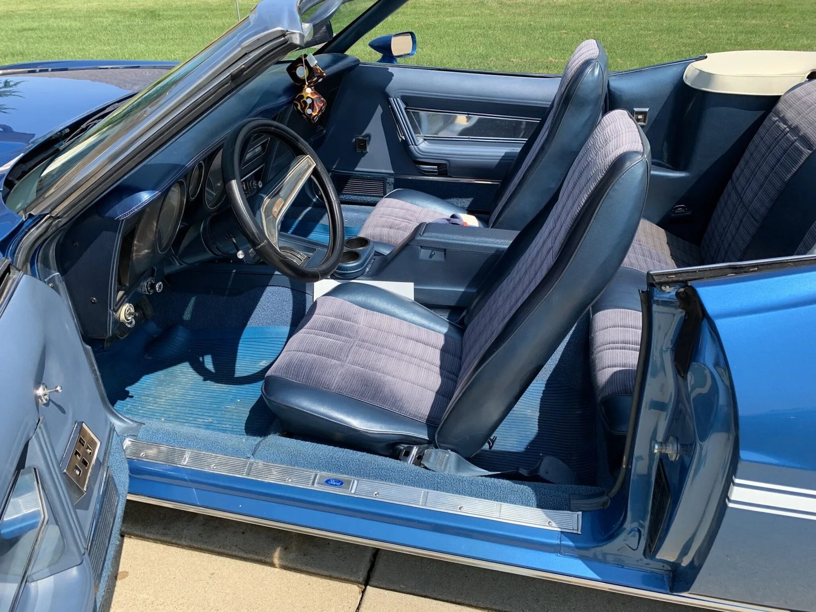 The cabin features seats upholstered in blue knit vinyl and replacement door panels, while the dashboard and center console are trimmed in black.