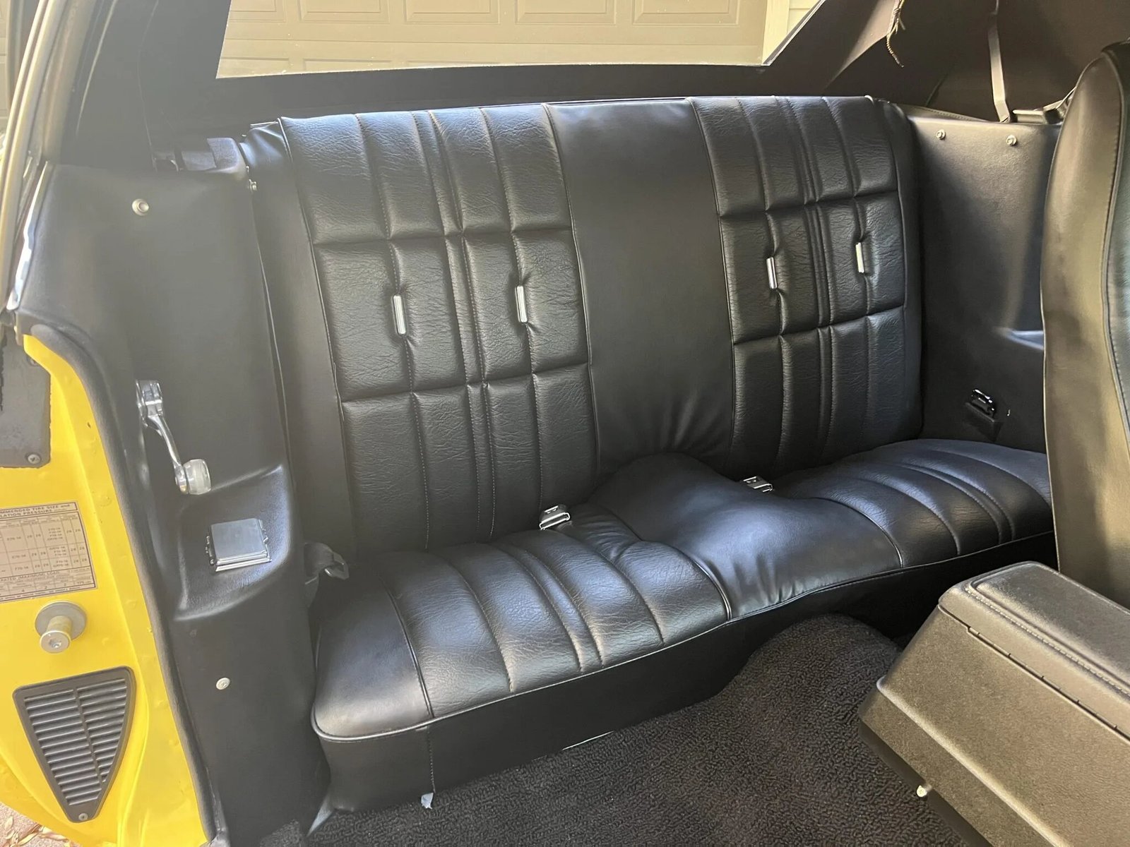 The cabin features seats upholstered in black vinyl with a color-matching dashboard, door panels, and carpeting.