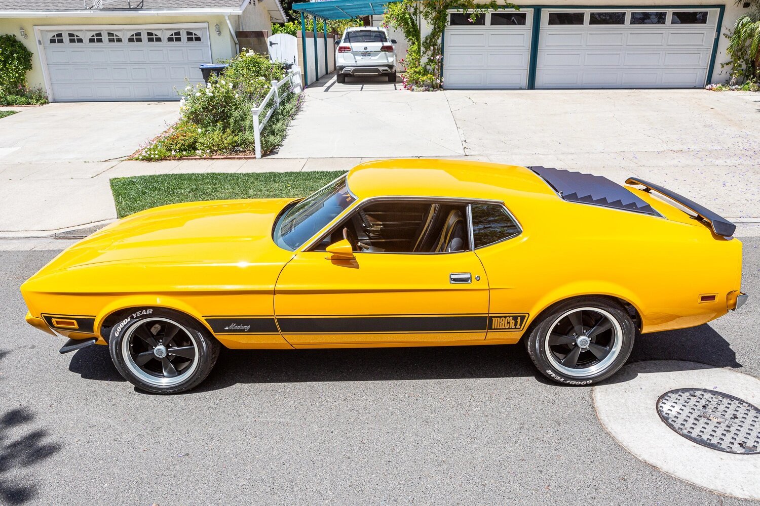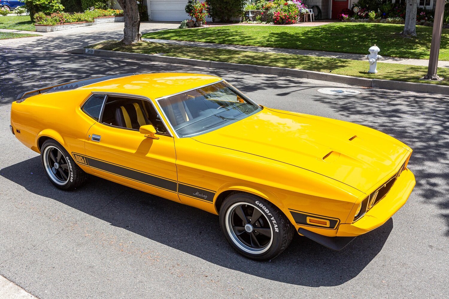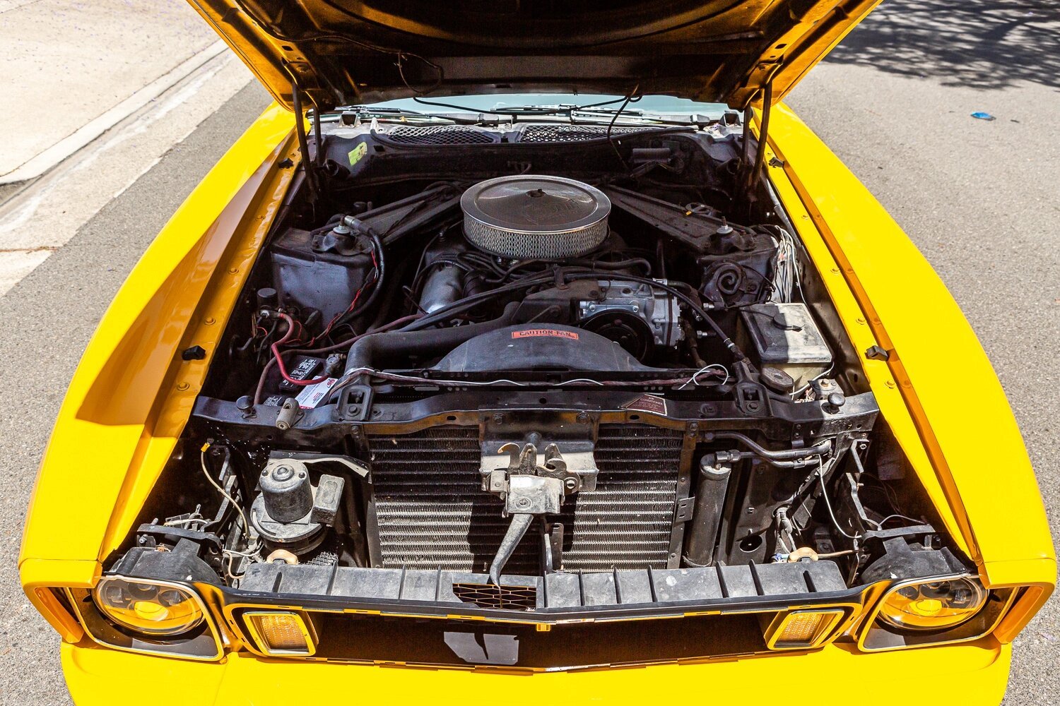 Equipment includes replacement black carpets, floor mats with Mustang logos, Scott Drake three-point seatbelts, a B&M shifter, and an aftermarket alarm system, power door locks, and push-button starter as well as a vintage-style stereo with an auxiliary input connected to aftermarket speakers and a 10″ subwoofer.