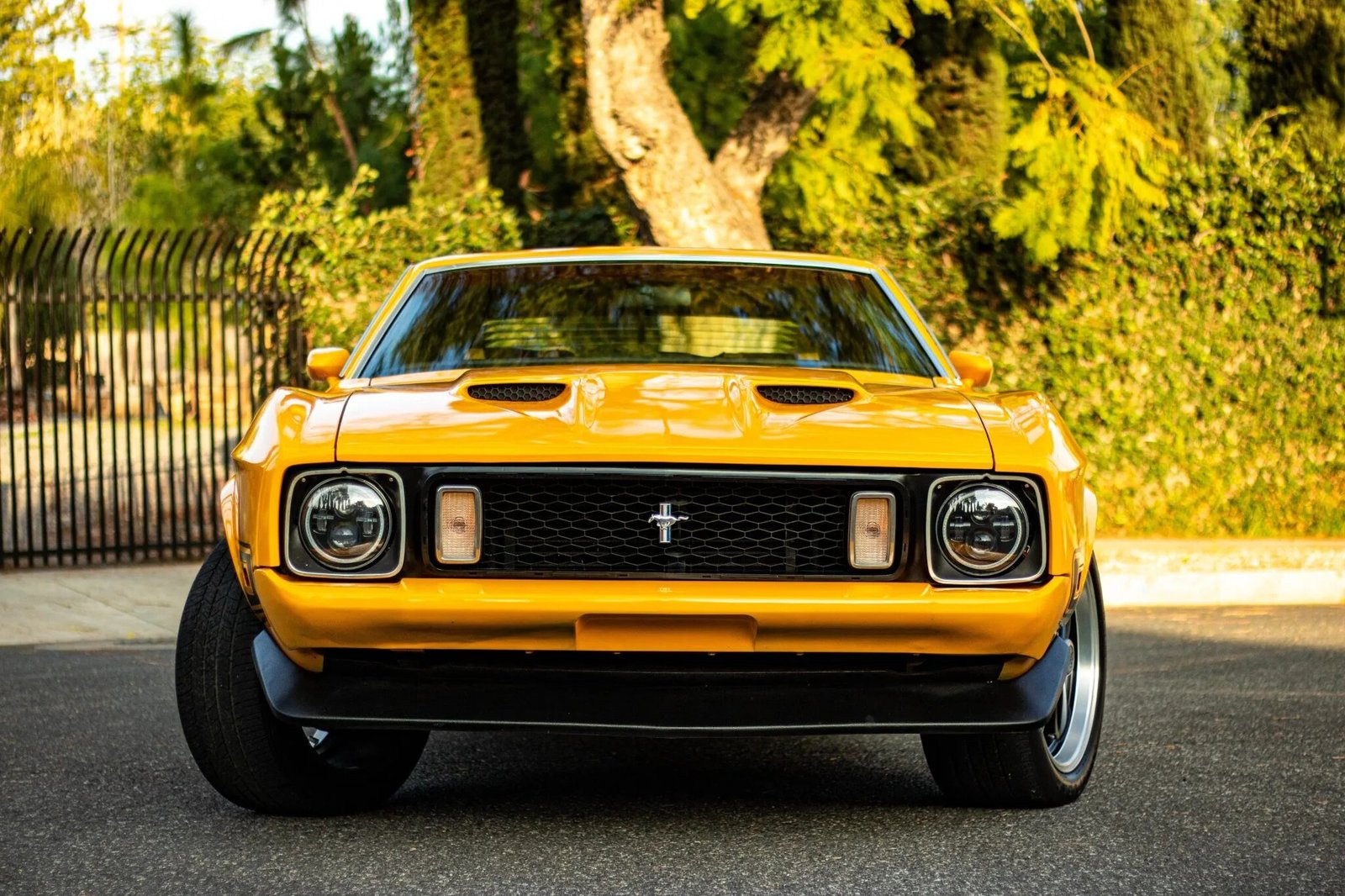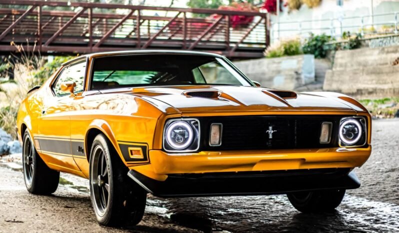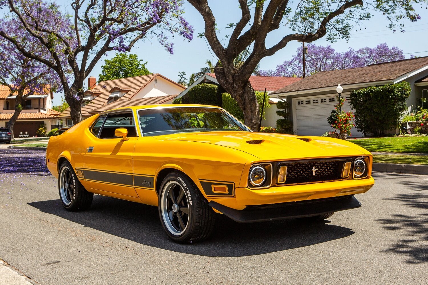 Equipment includes replacement black carpets, floor mats with Mustang logos, Scott Drake three-point seatbelts, a B&M shifter, and an aftermarket alarm system, power door locks, and push-button starter as well as a vintage-style stereo with an auxiliary input connected to aftermarket speakers and a 10″ subwoofer.