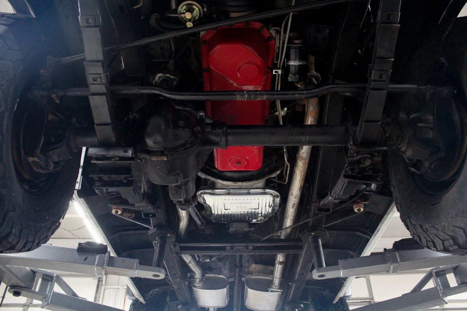 The 345ci V8 features a dual exhaust system and a FiTech fuel injection system that was installed. A fuel-sending unit has been replaced. Power is sent to the rear or all four wheels through a three-speed 727 Torqueflite automatic transmission, a dual-range transfer case, and open differentials with a 3.54:1 gear set. A later-model front axle have been fitted and additional work have included servicing the transmission and transfer case, replacing the rear axle bearings and seals, and cleaning and refinishing the underside of the truck in black.