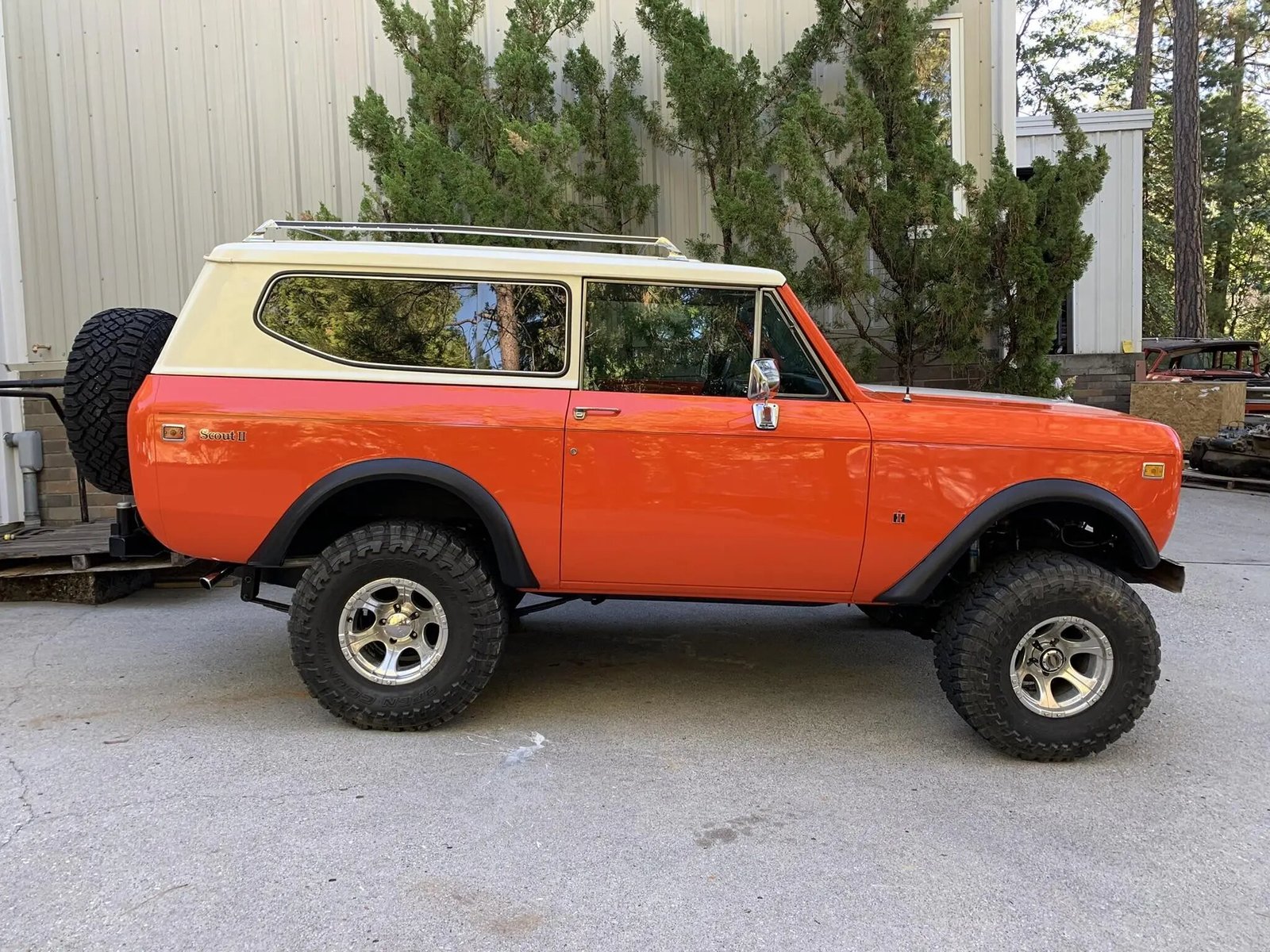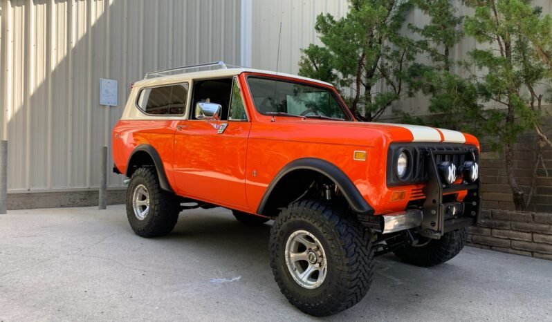 This 1973 International Harvester Scout II is finished in orange over black and tan upholstery and is powered by a replacement 383ci Chevrolet V8 paired with a four-speed automatic transmission and Dana 300 dual-range transfer case.