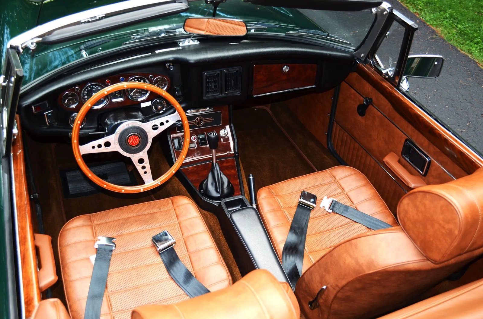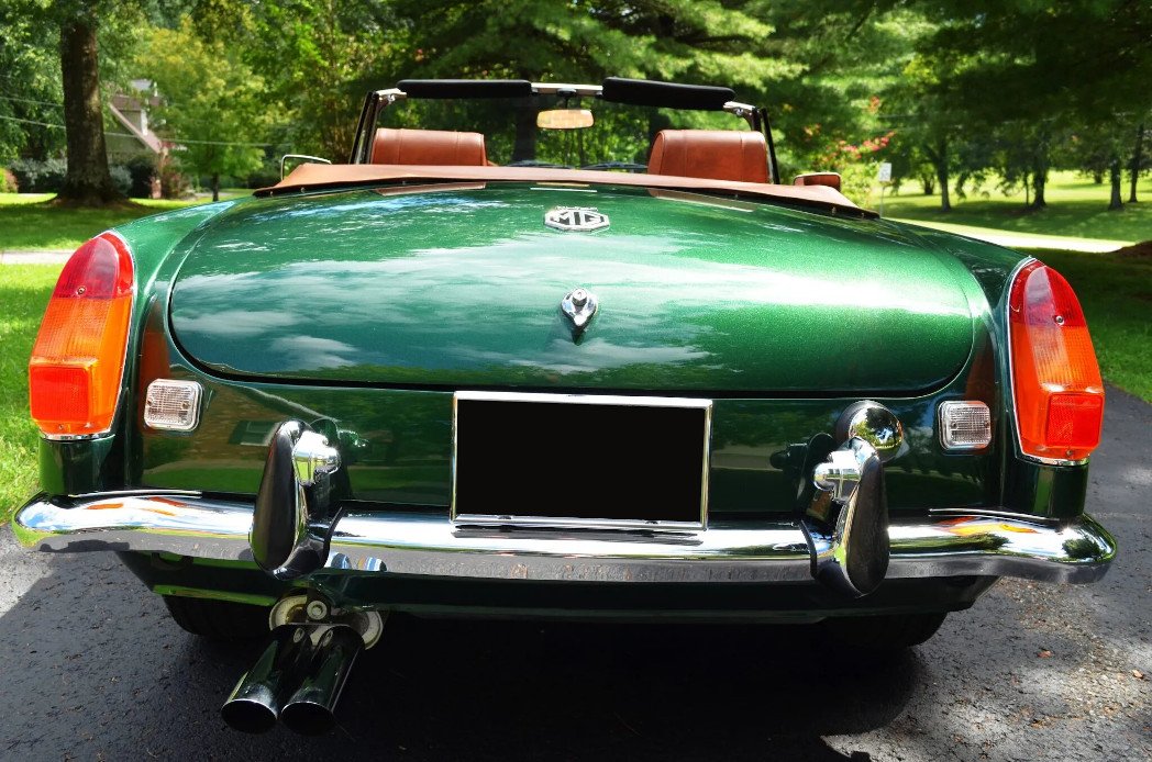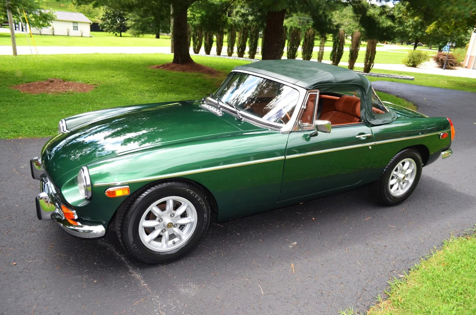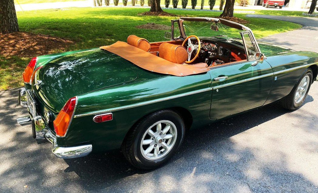 This 1973 MG MGB roadster received a cosmetic and mechanical refresh in 2017, which included a repaint in green. It is powered by a 1.8-liter inline-four mated to a four-speed manual transmission with overdrive and is equipped with 14″ Minator wheels, front disc brakes, a green vinyl soft top, a tan top boot, chrome bumpers and trim, and a Lecarra steering wheel.