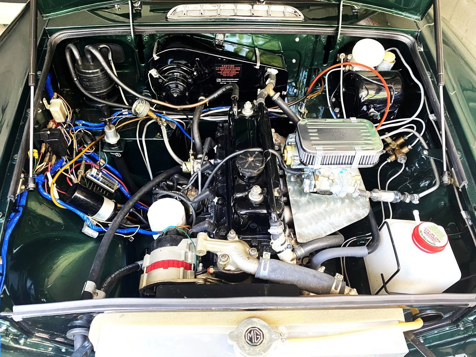 The 1.8-liter inline-four is fitted with a single Weber carburetor along with an aluminum radiator, a carburetor heat shield, and heat-wrapped exhaust headers. An oil change was performed in preparation for the sale. Power is sent to the rear wheels through a four-speed manual gearbox with an electrically actuated overdrive unit.