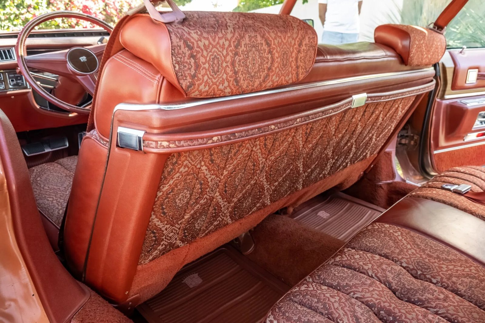 The front and rear bench seats are upholstered in Terra Cotta Maharaja cloth with leather accents, and woodgrain trim accents the door panels and dashboard.