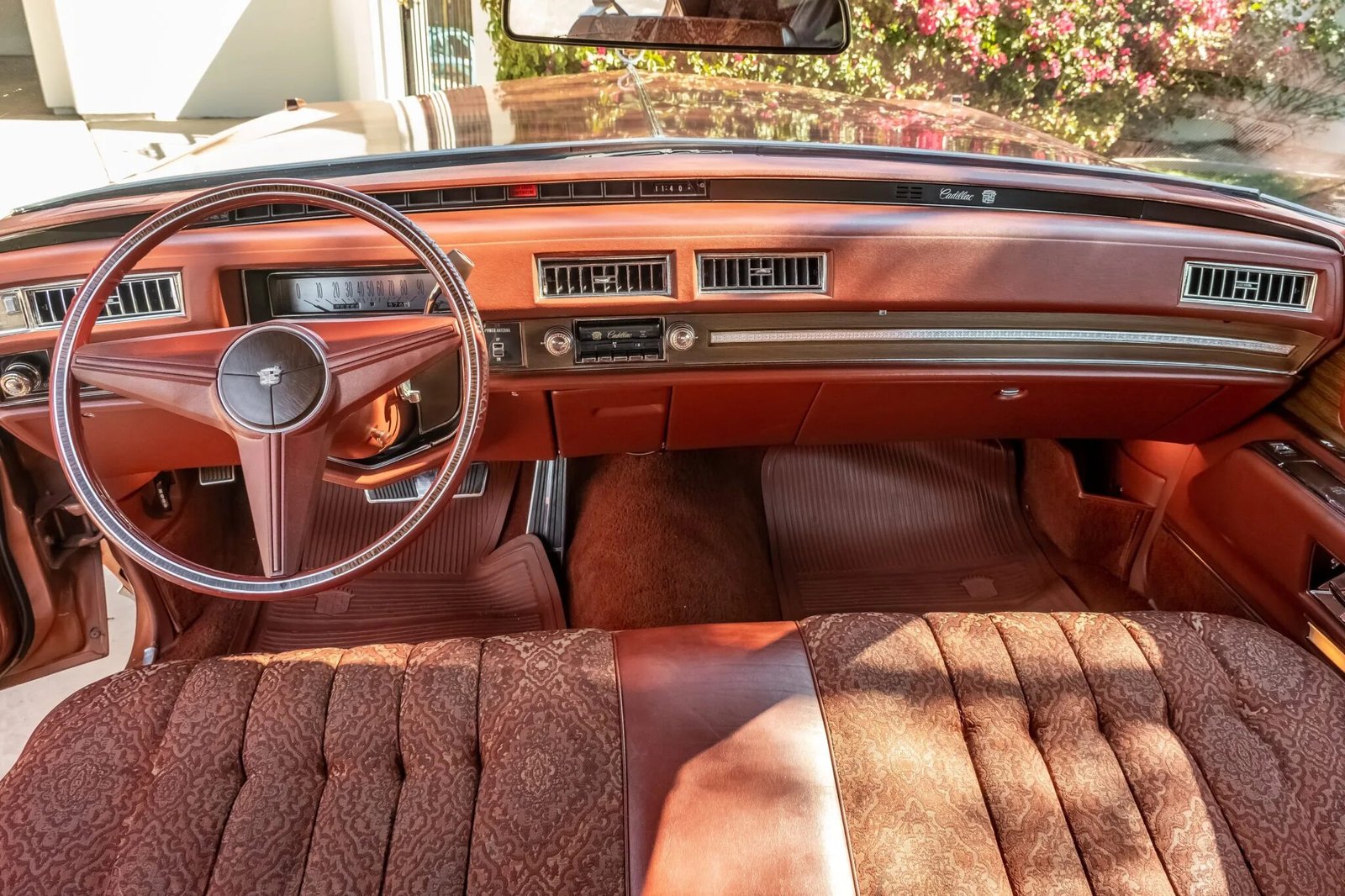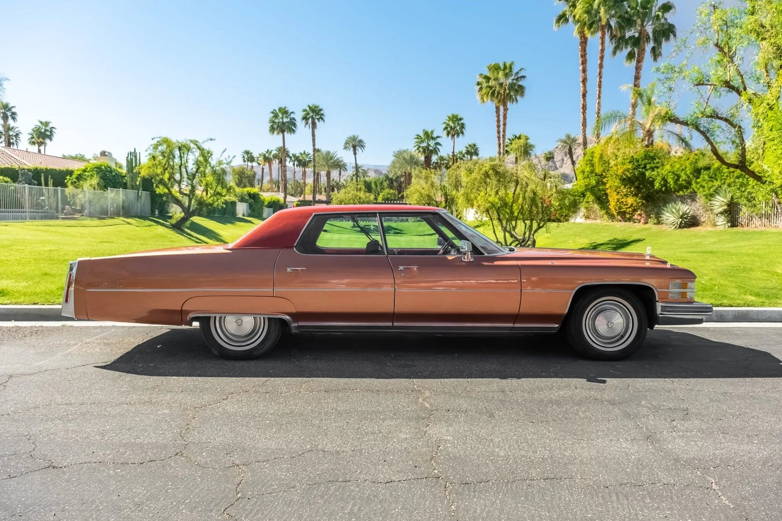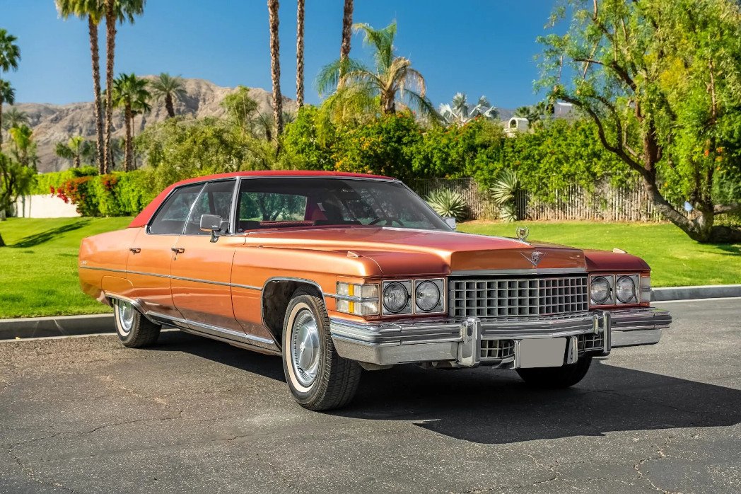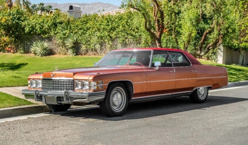 The vinyl roof was replaced during the repaint, and additional exterior details include quad headlights, an egg-crate grille, fender-mounted indicators, a Cadillac-crest hood ornament, chrome bumpers, and a thermometer mounted to the driver’s side mirror.
