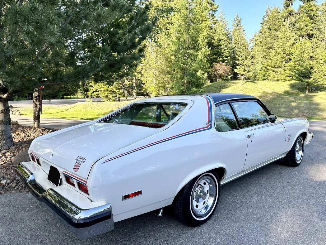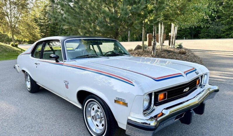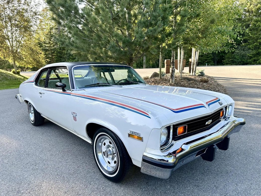 This 1974 Chevrolet Nova hatchback is one of approximately 14,463 examples equipped with the Spirit of America package produced in anticipation of the US bicentennial in 1976. The car is finished in white with red and blue stripes over white upholstery, and power comes from a 350ci V8 mated to a three-speed automatic transmission. Equipment includes a black vinyl roof covering, 14″ Rally-style wheels, power steering, power-assisted front disc brakes, a dual exhaust system, air conditioning, a center console, and an AM/FM radio.