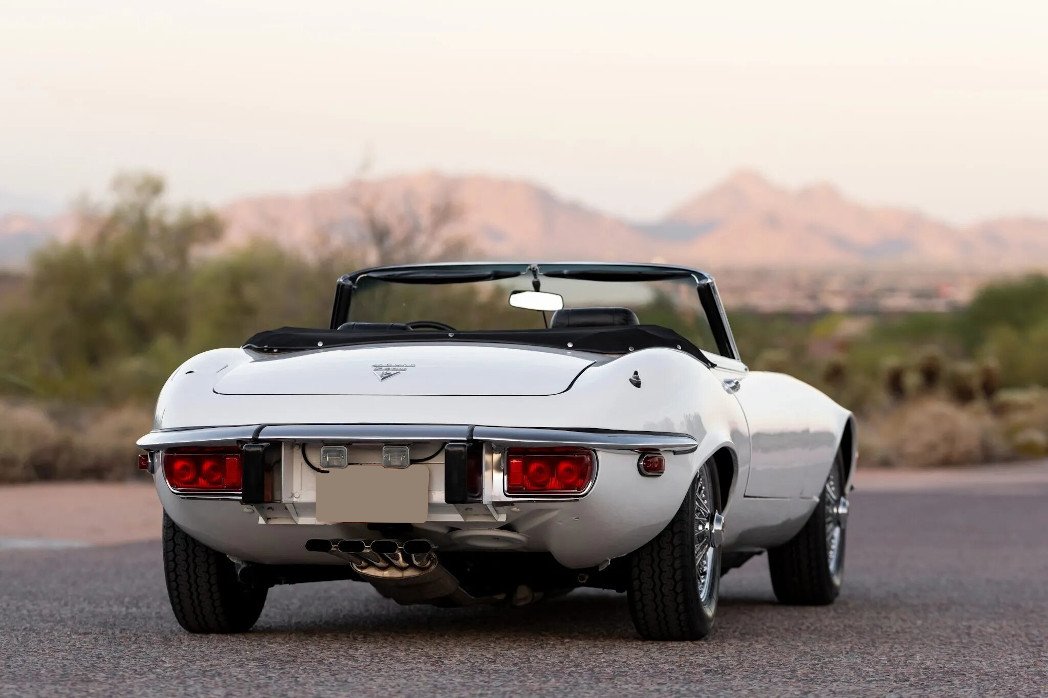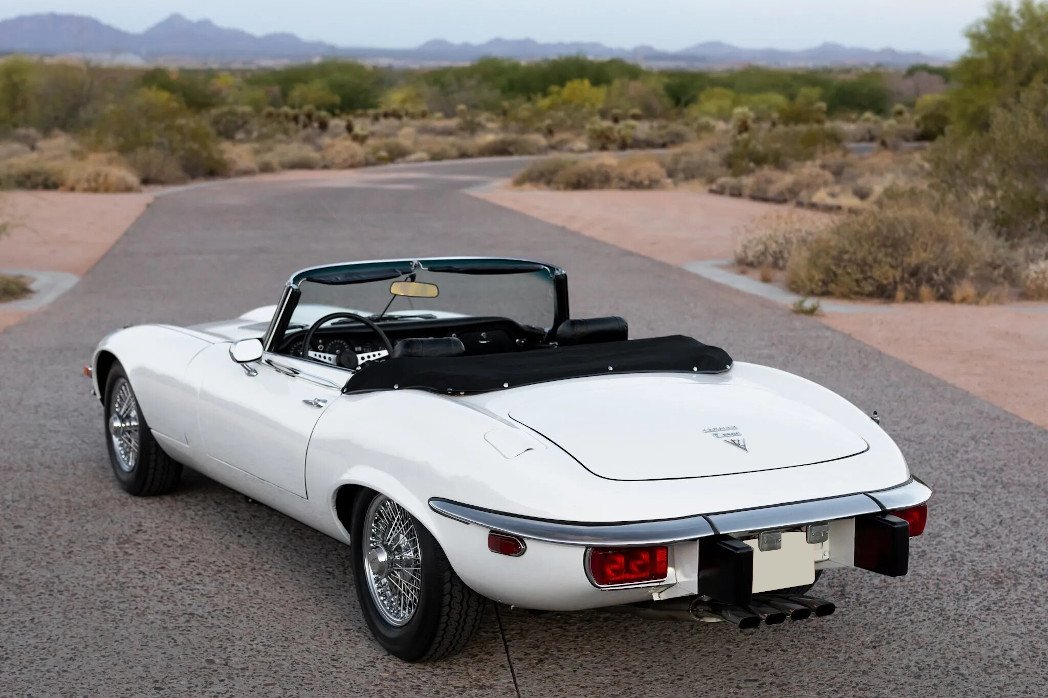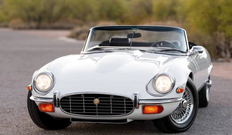 This 1974 Jaguar XKE is a white-over-black roadster that was built on November 28, 1973. Power is provided by a 5.3-liter V12 mated with a four-speed manual transmission, and additional equipment includes a black soft top, air conditioning, a Sony Cassette stereo, quad Zenith-Stromberg carburetors, four-wheel disc brakes, and 15″ chrome wire wheels. Work in preparation for sale included refurbishing the carburetors, changing fluids, cleaning the fuel system, and replacing the battery, ignition components, brake components, and tires.