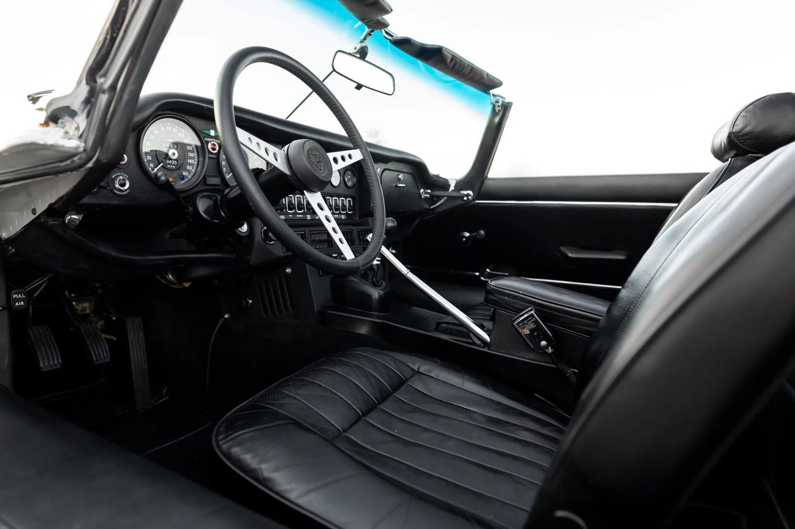 The three-spoke steering wheel is wrapped in leather and fronts Smiths instrumentation including a 160-mph speedometer and a tachometer with a 6,500-rpm redline, while auxiliary gauges are mounted in the center of the dashboard.