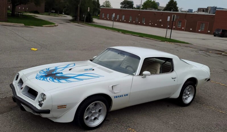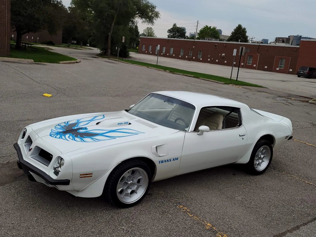 This 1974 Pontiac Firebird Trans Am is finished in white over white and powered by a 455ci V8 paired with a three-speed automatic transmission.