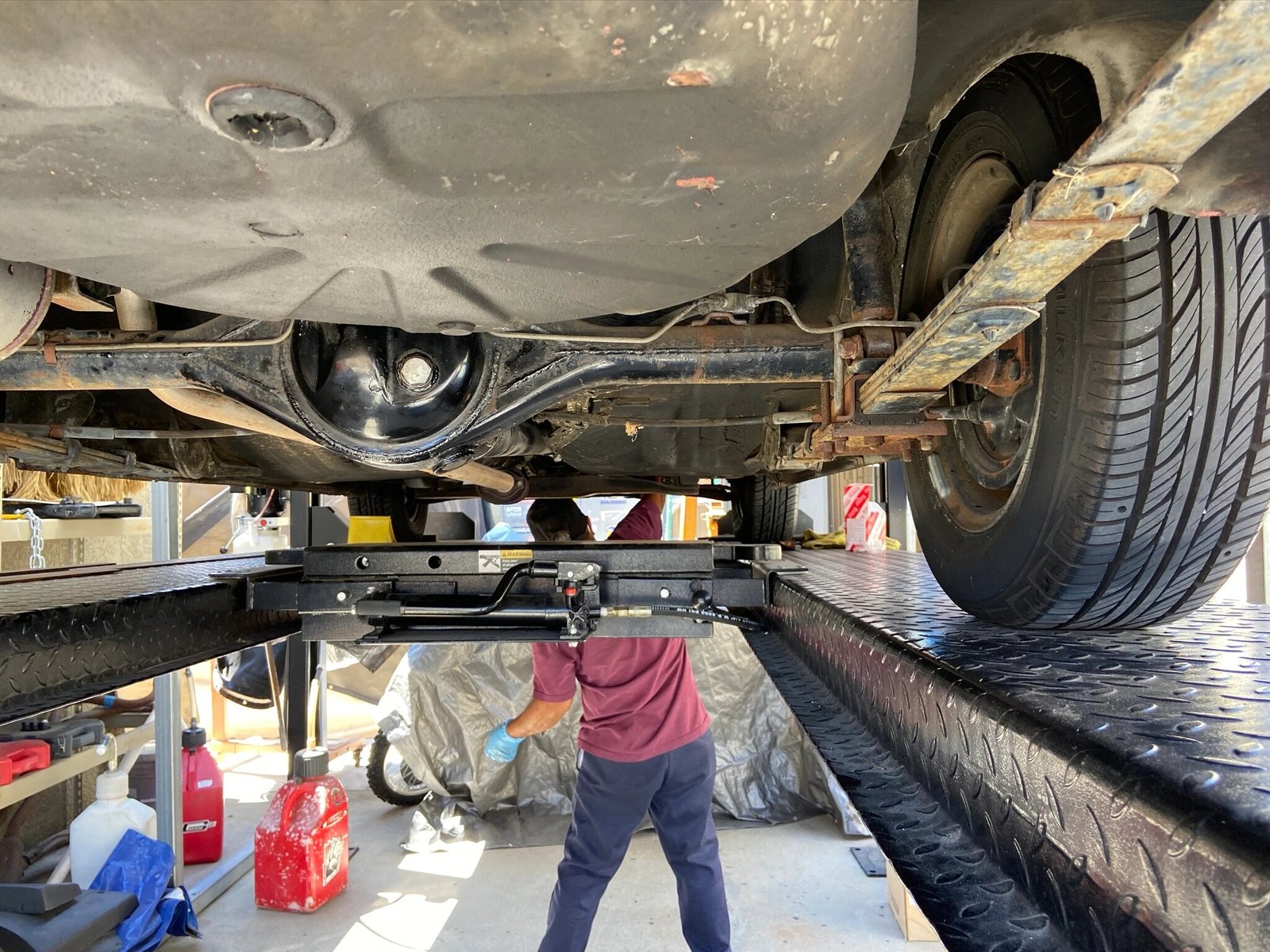 The car is equipped with a front sway bar, and braking is handled by front discs and rear drums.