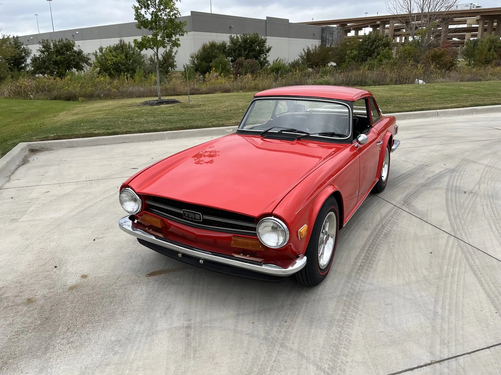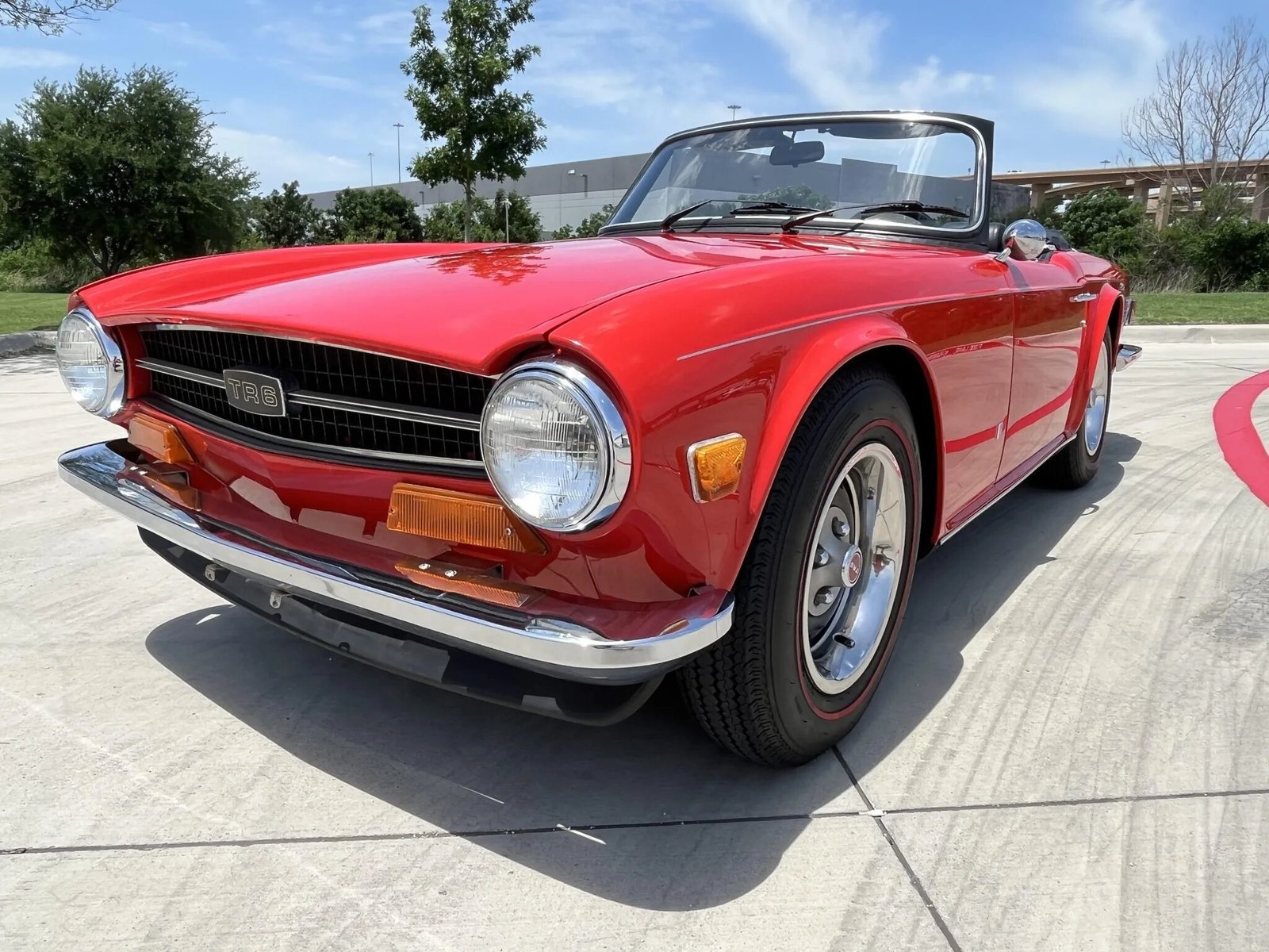 This 1974 Triumph TR6 is finished in red over black vinyl and powered by a 2.5-liter inline-six paired with a four-speed manual transmission.