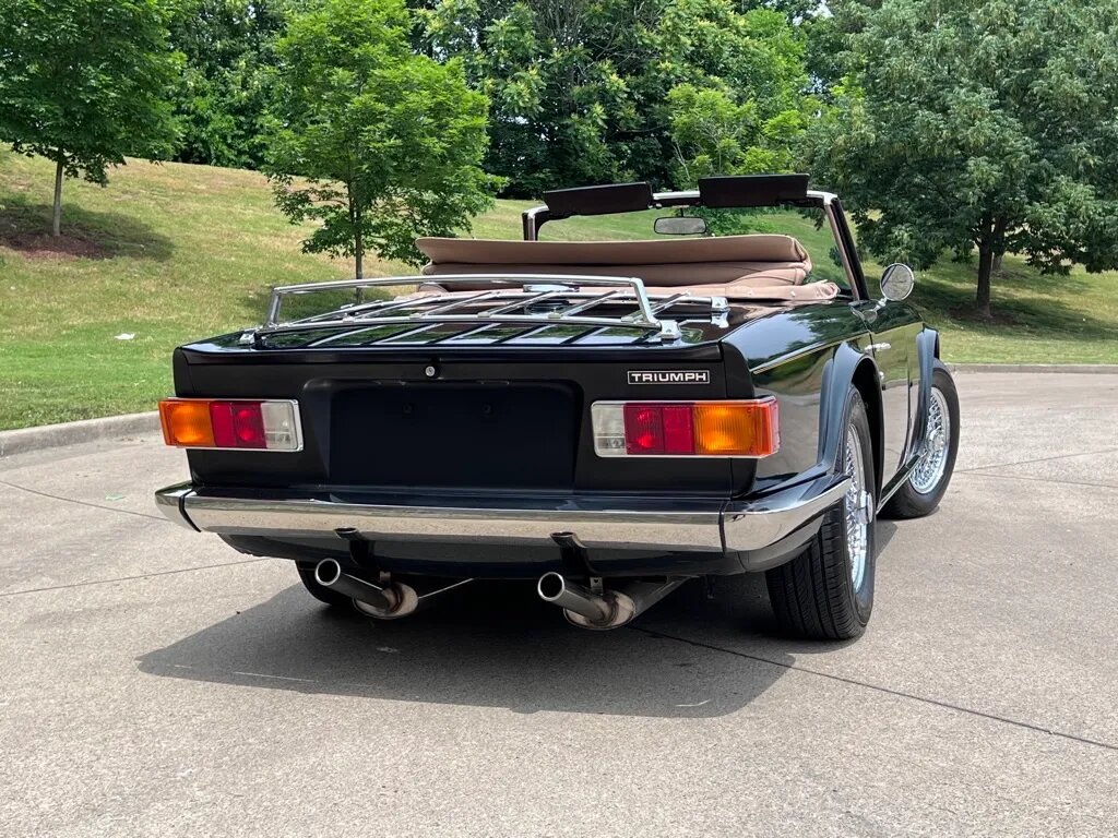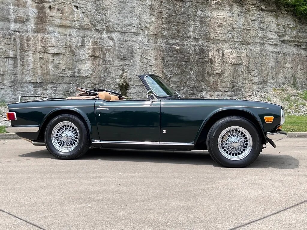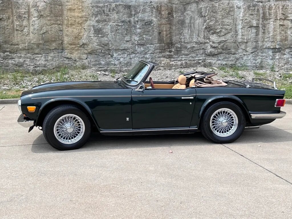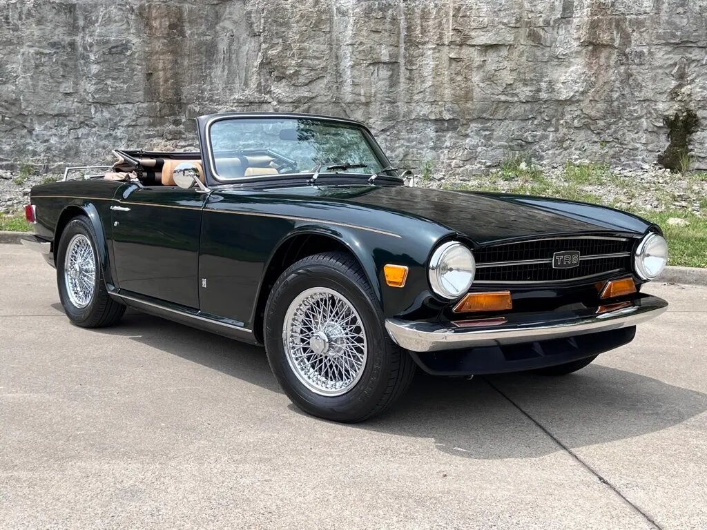 The car is finished in metallic green over tan upholstery and is powered by a 2.5L inline-six mated to a replacement four-speed manual transmission with overdrive.Additional equipment includes a tan soft top, chrome 15″ knock-off wire wheels, power-assisted front disc brakes, dual Zenith Stromberg carburetors, a stainless-steel dual exhaust system, a trunk-mounted luggage rack, a Nardi wood-rimmed steering wheel, earlier-model instrumentation, and a RetroSound stereo.