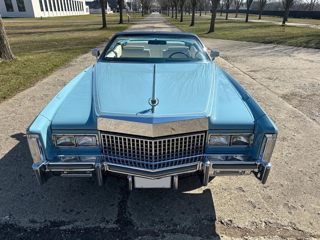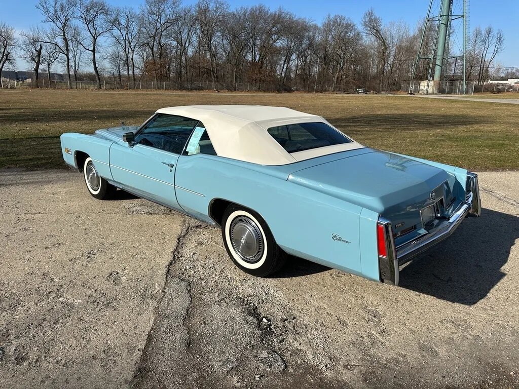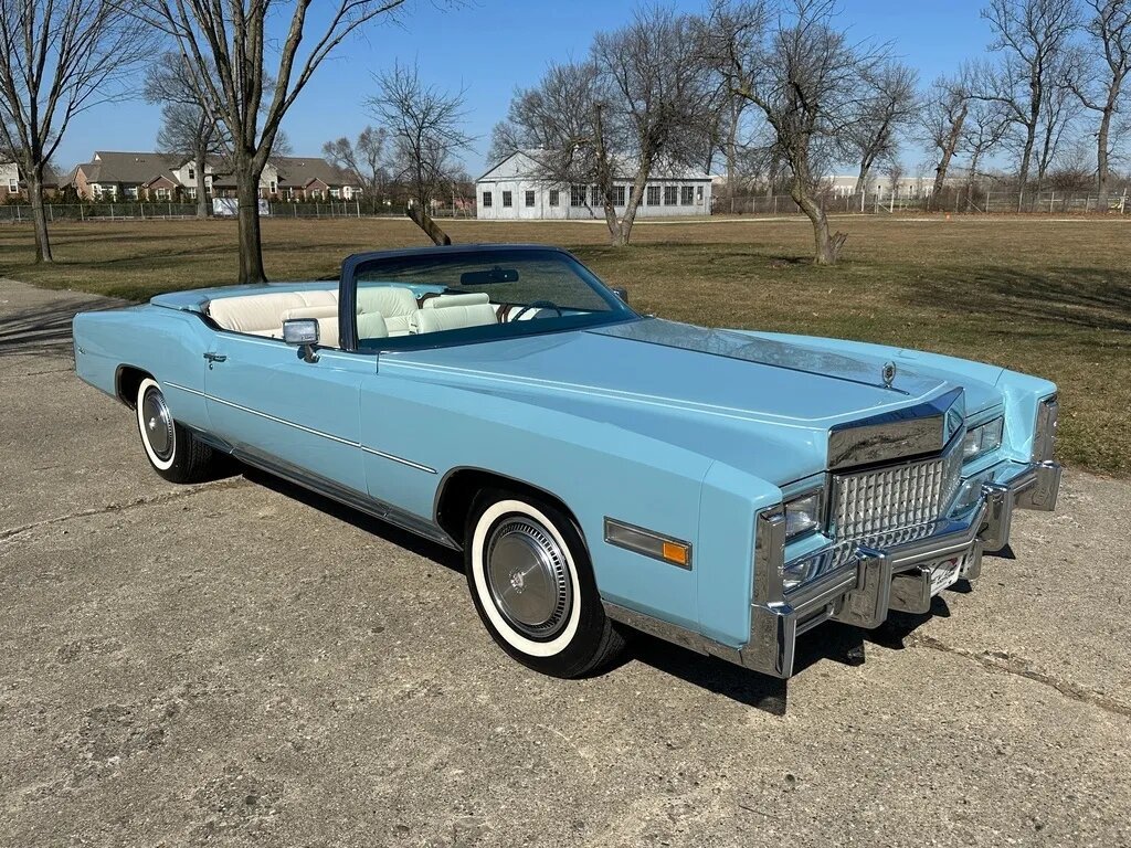 This 1975 Cadillac Eldorado Convertible was sold new at Paul McGlone Cadillac of Harper Woods, Michigan. Finished in Jennifer Blue over white leather upholstery, the car is powered by a 500ci V8 paired with a three-speed automatic transmission. Equipment includes a power-operated white convertible top, a power antenna, 15″ steel wheels, polished wheel covers, front disc brakes, and the cabin is outfitted with an AM/FM stereo with an eight-track cassette player as well as a rear window defroster, an illuminated thermometer, automatic climate control, power windows, and a power-adjustable front bench.