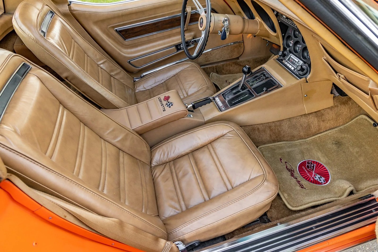 Equipment includes a center console, power windows, Corvette-logo floor mats, dashboard map pockets, and a Delco push-button AM/FM stereo.