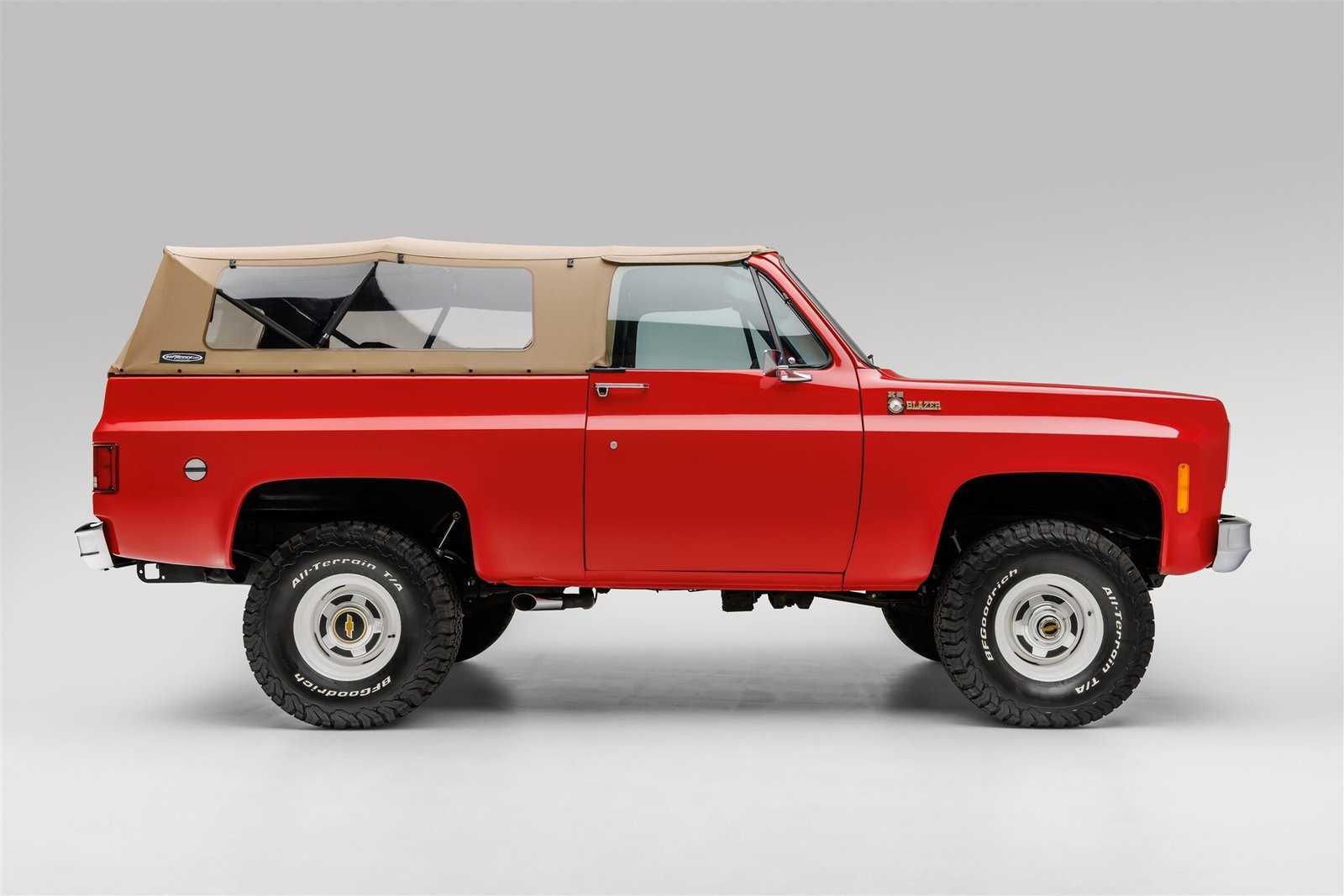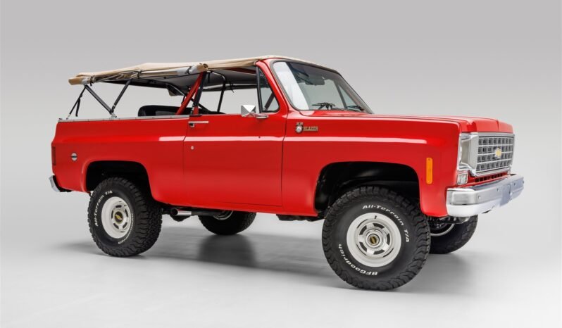 Additional features include a tan Softopper removable soft top, side mirrors, polished side-exiting exhaust finishers, and fender-mounted K5 Blazer badging.