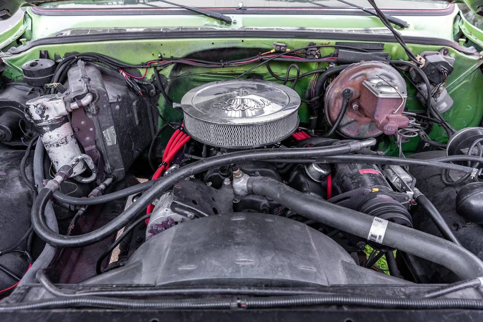 The 350ci V8 has been modified with fuel injection, headers, and an aftermarket dual exhaust system.