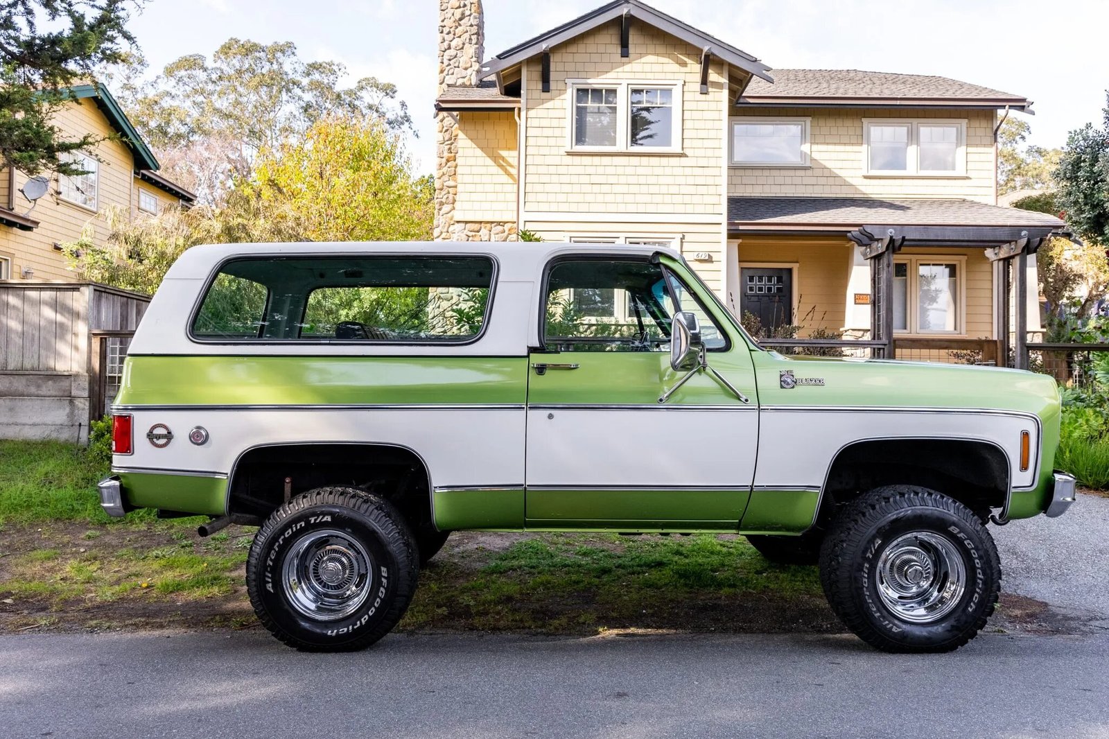 The truck is finished in two-tone green and white and equipped with a removable white hardtop, chrome bumpers and trim, a brush guard with auxiliary lights, and dual exhaust outlets as well as K5 Blazer and Cheyenne badging.