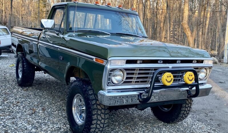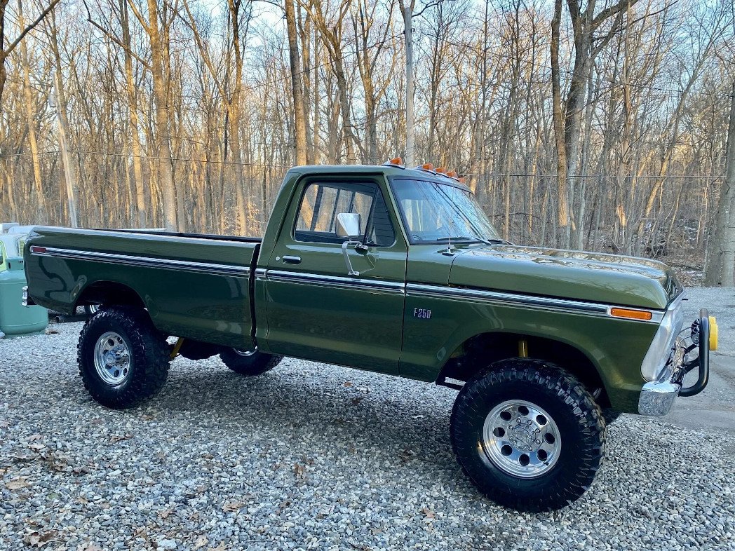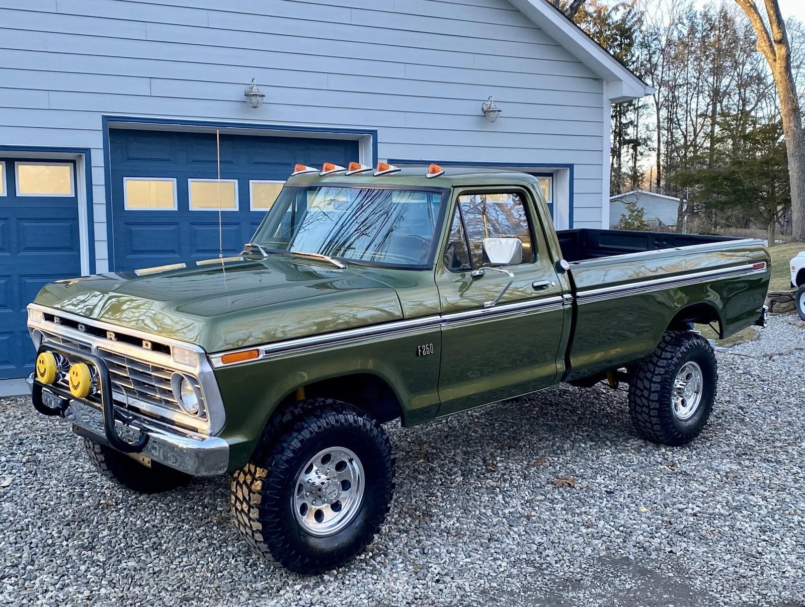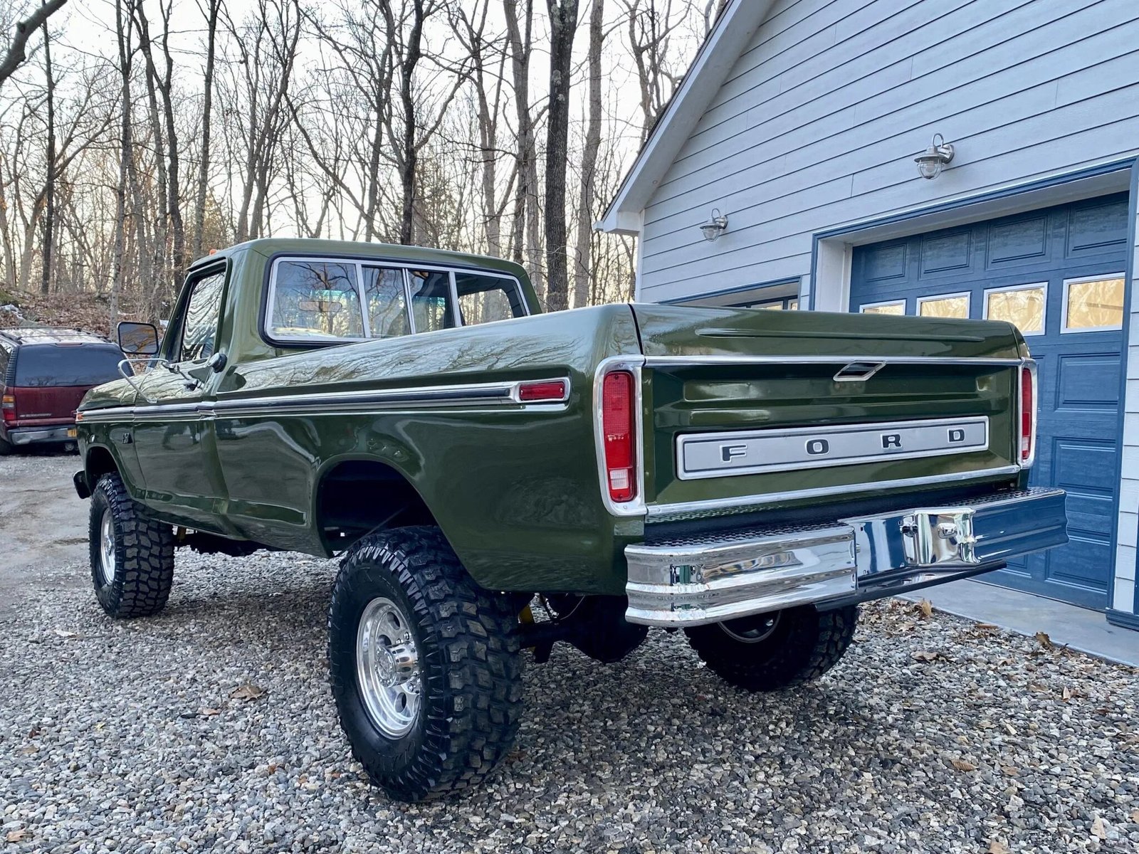 Power is provided by a Y-code 360ci V8 paired with a three-speed automatic transmission and a dual-range transfer case, and the truck is finished in green over black upholstery.