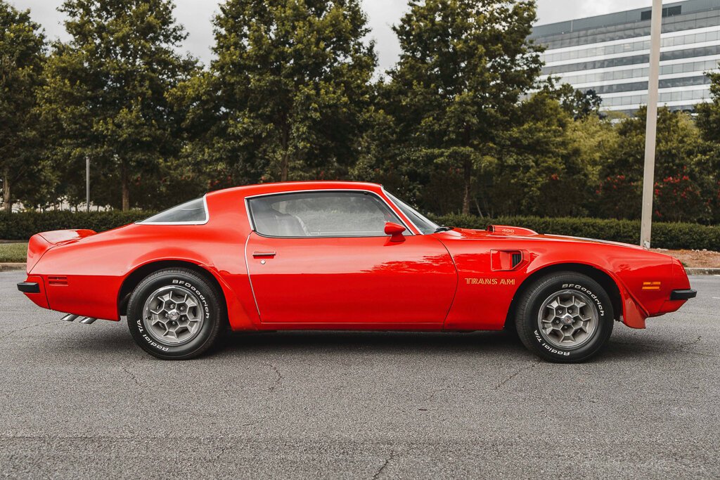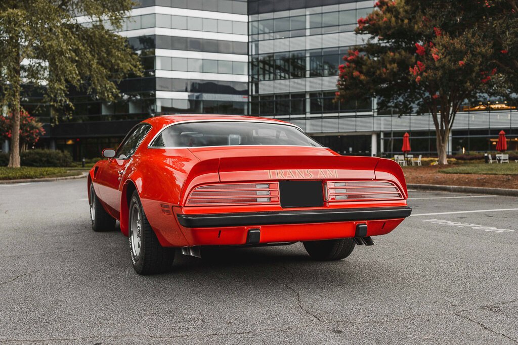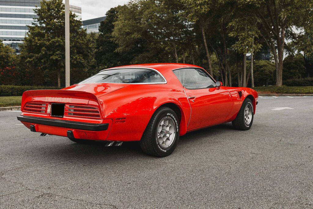 Exterior details include a shaker hood with a Trans Am decal, black-finished bumpers, vented fenders with orange Trans Am decals, quad exhaust outlets, and a rear spoiler.