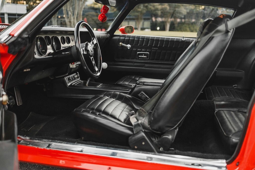 The car is powered by a 400ci V8 mated to a four-speed manual transmission and is equipped with a shaker hood, quad exhaust outlets, Flowmaster mufflers, honeycomb 15” wheels, a Hurst shifter, and an aftermarket head unit.