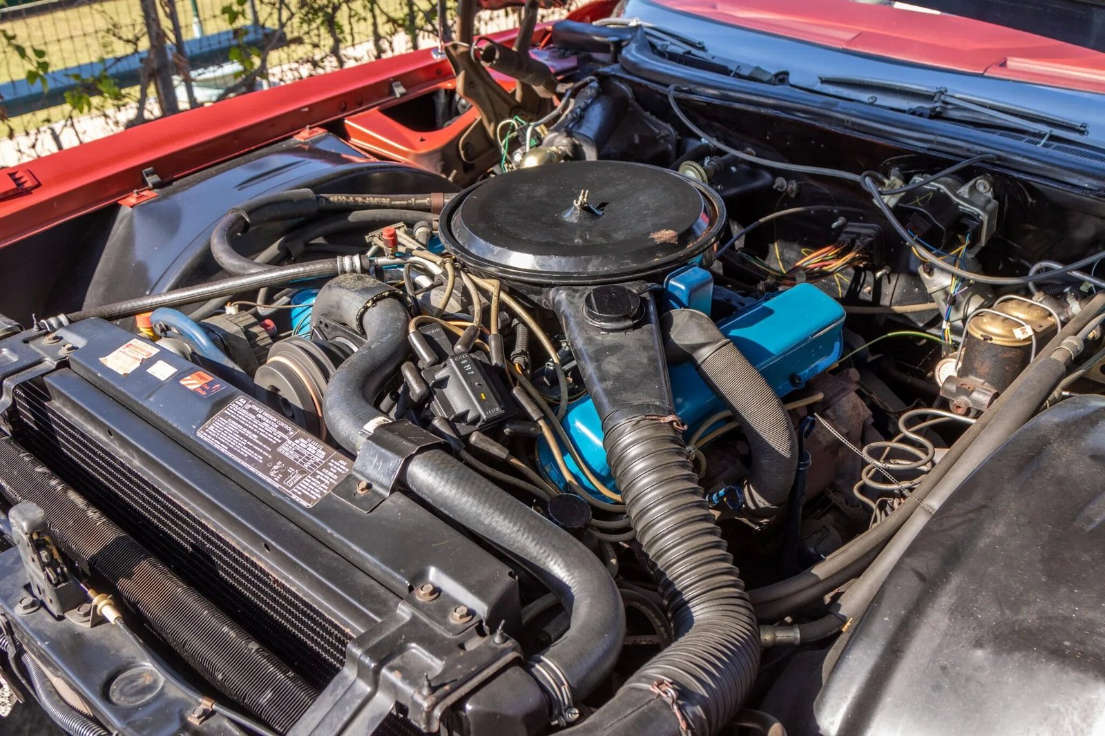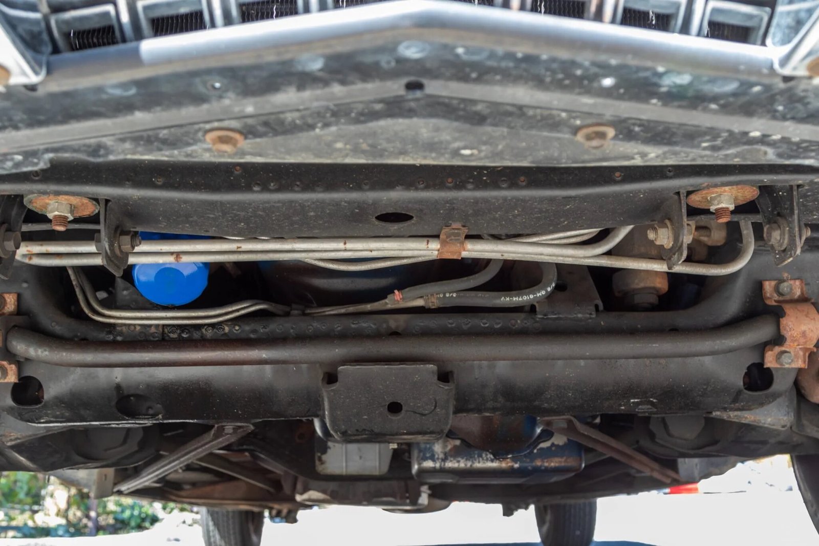 Factory 15″ steel wheels wear black-finished Cadillac hubcaps and are mounted with Uniroyal PR6 Steel Belted Radial tires.