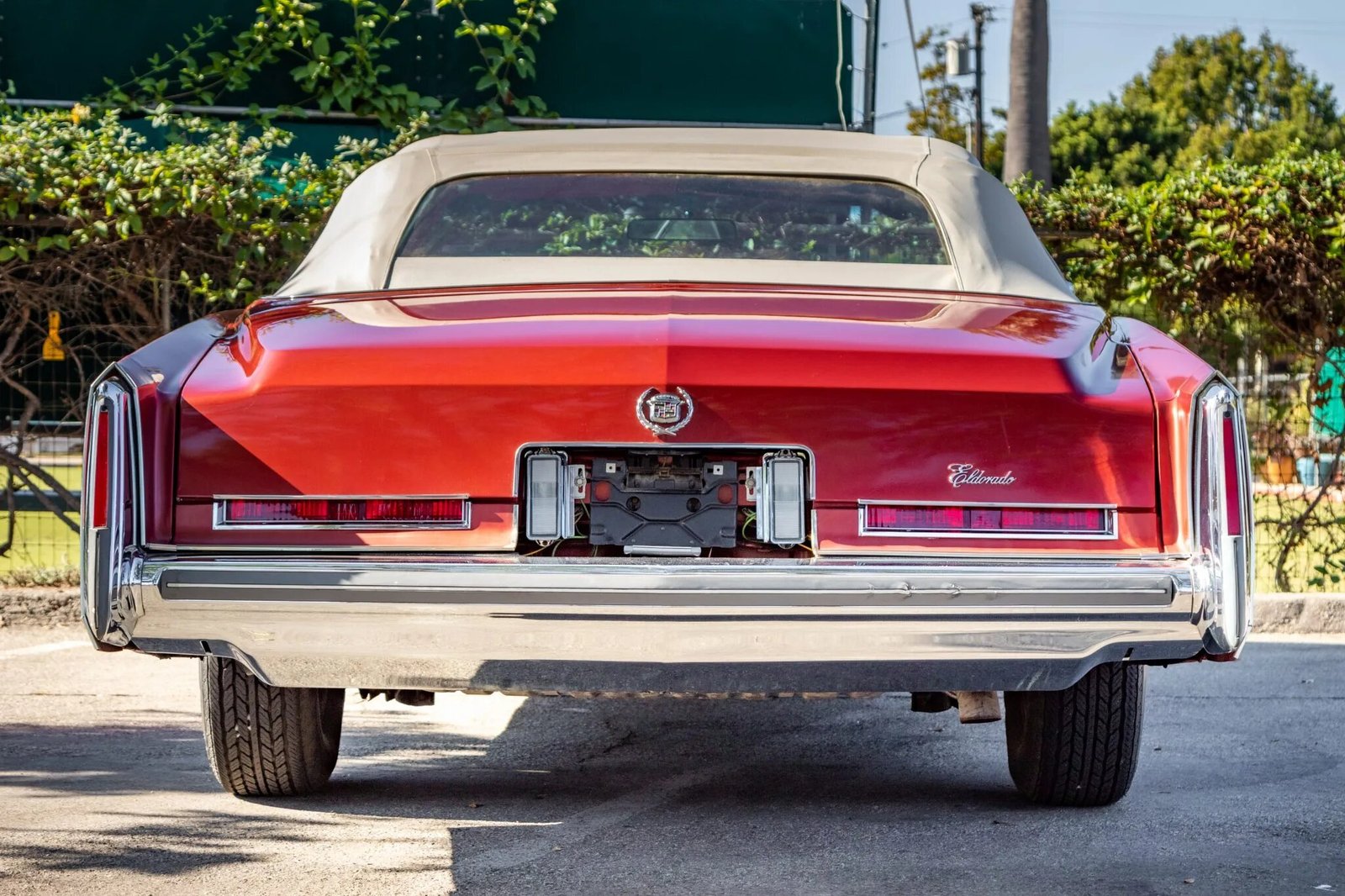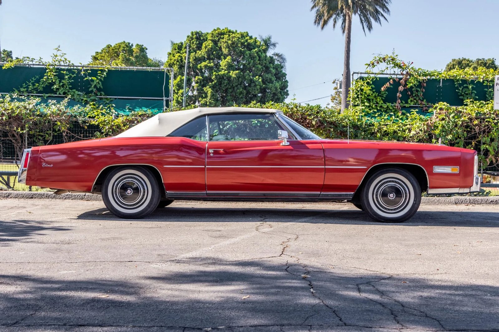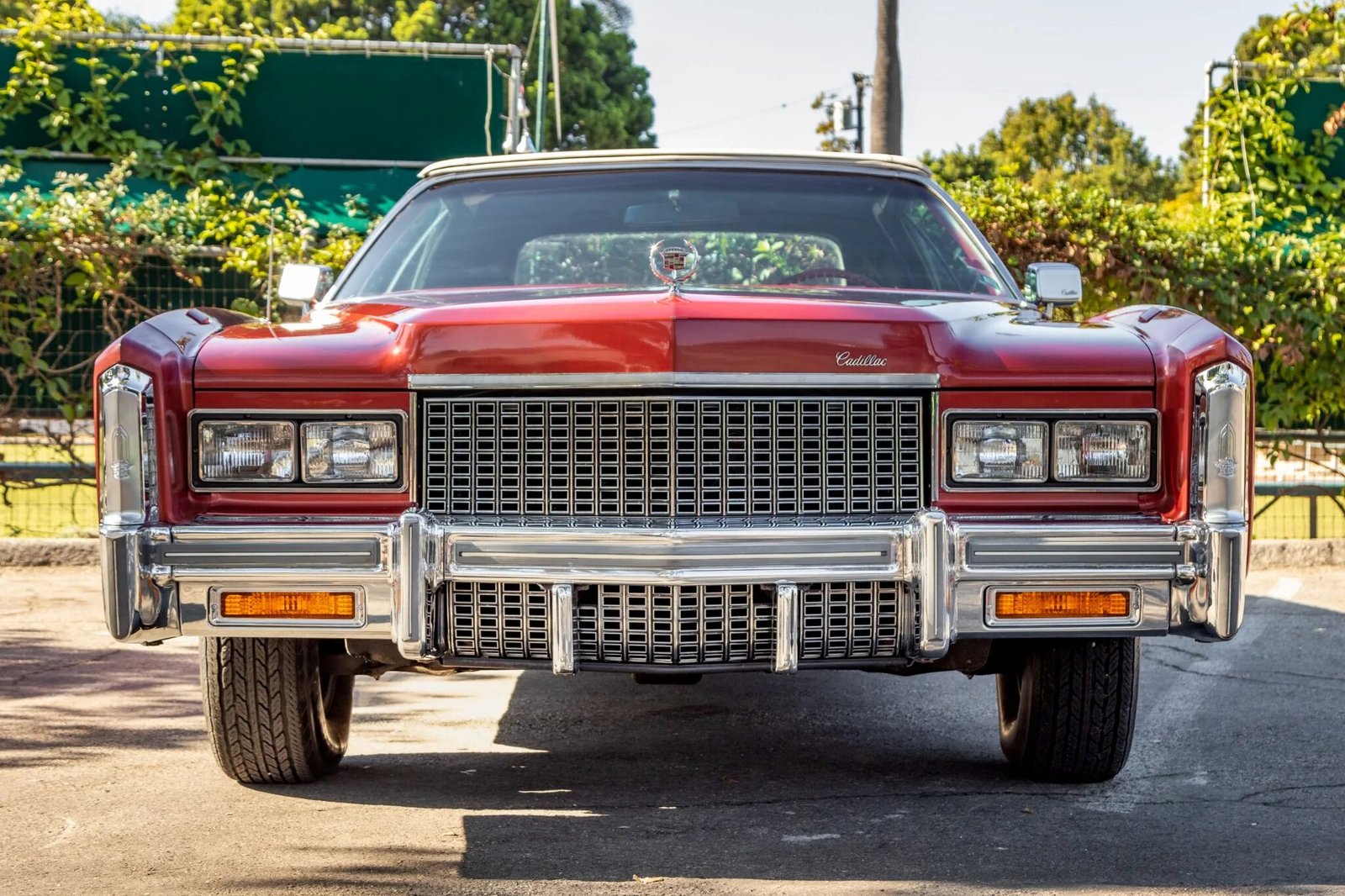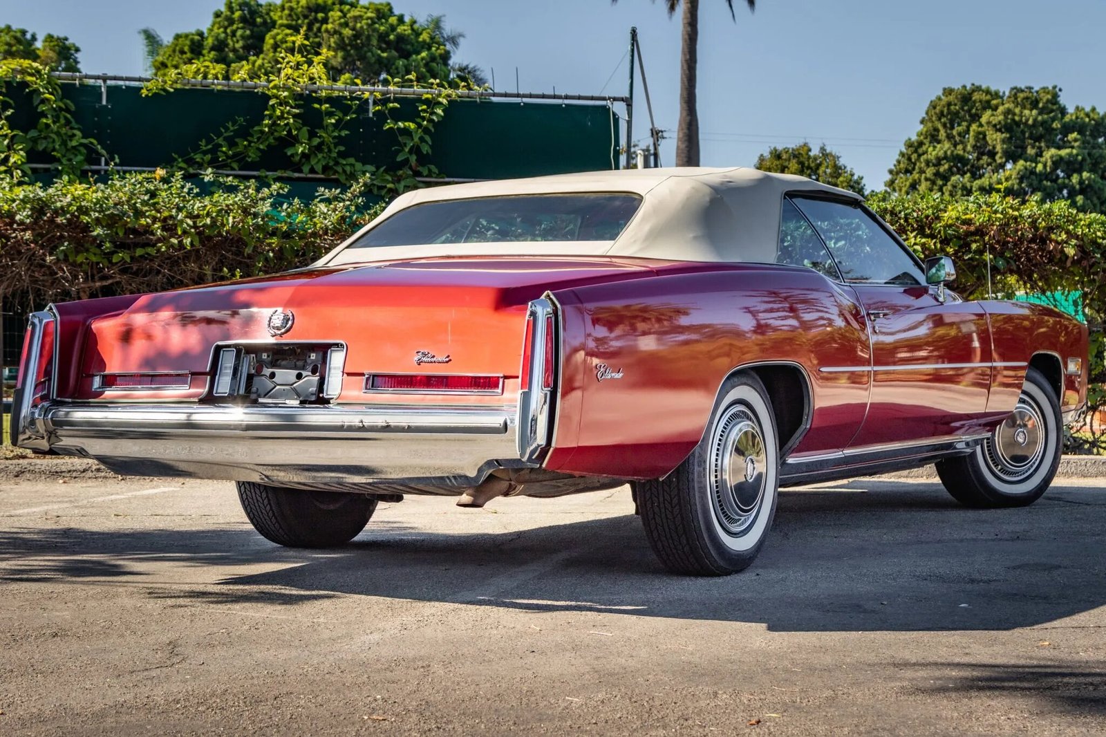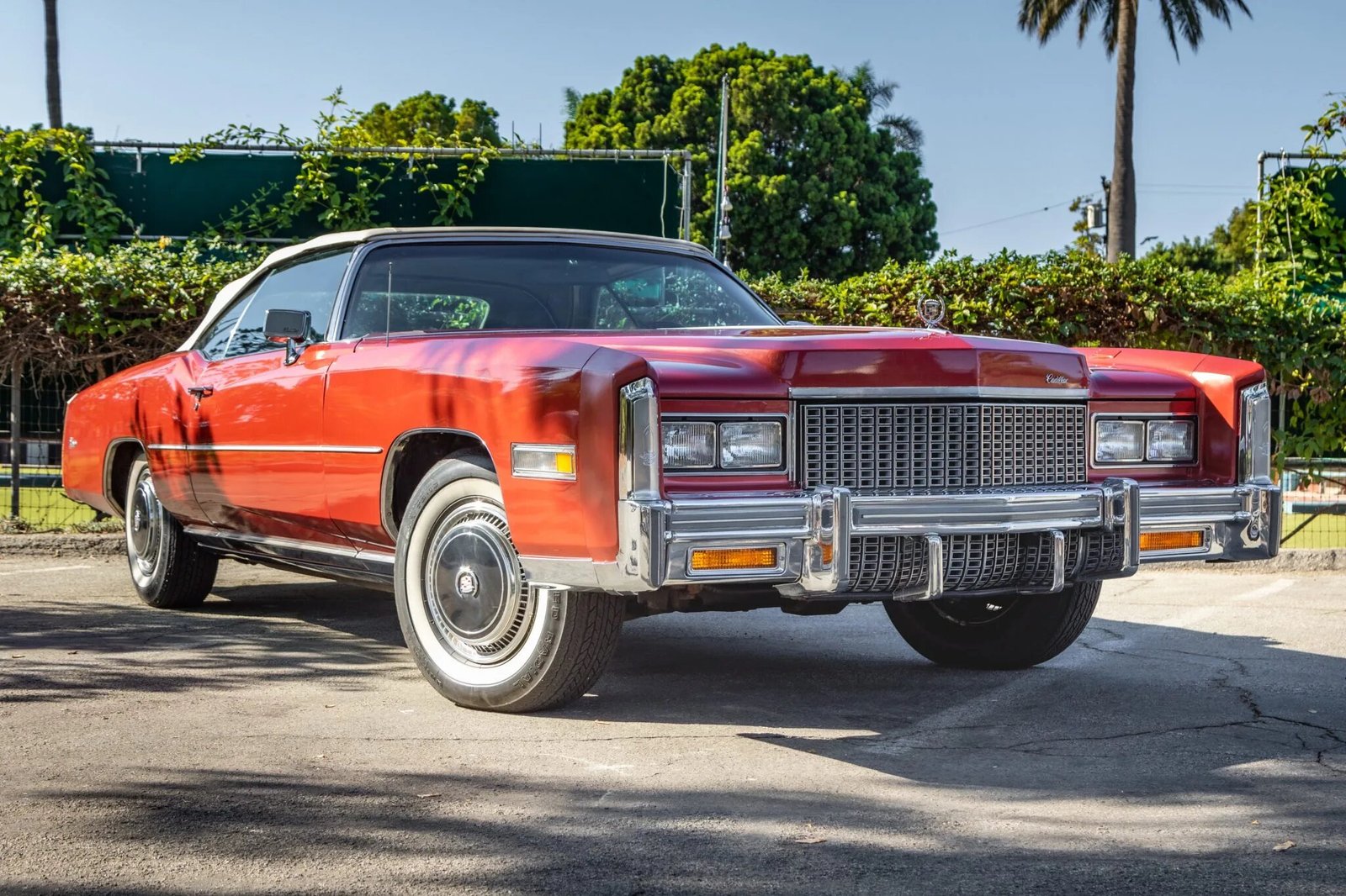 This 1976 Cadillac Eldorado convertible is finished in Firethorn Metallic over white upholstery, and its 500ci V8 is paired with a three-speed automatic transmission.