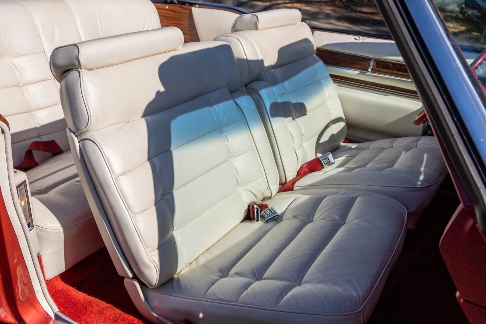 Woodgrain trim accents the dashboard and door panels, and amenities include power-adjustable front seats, power windows, automatic climate control, and an AM/FM radio with an eight-track player.