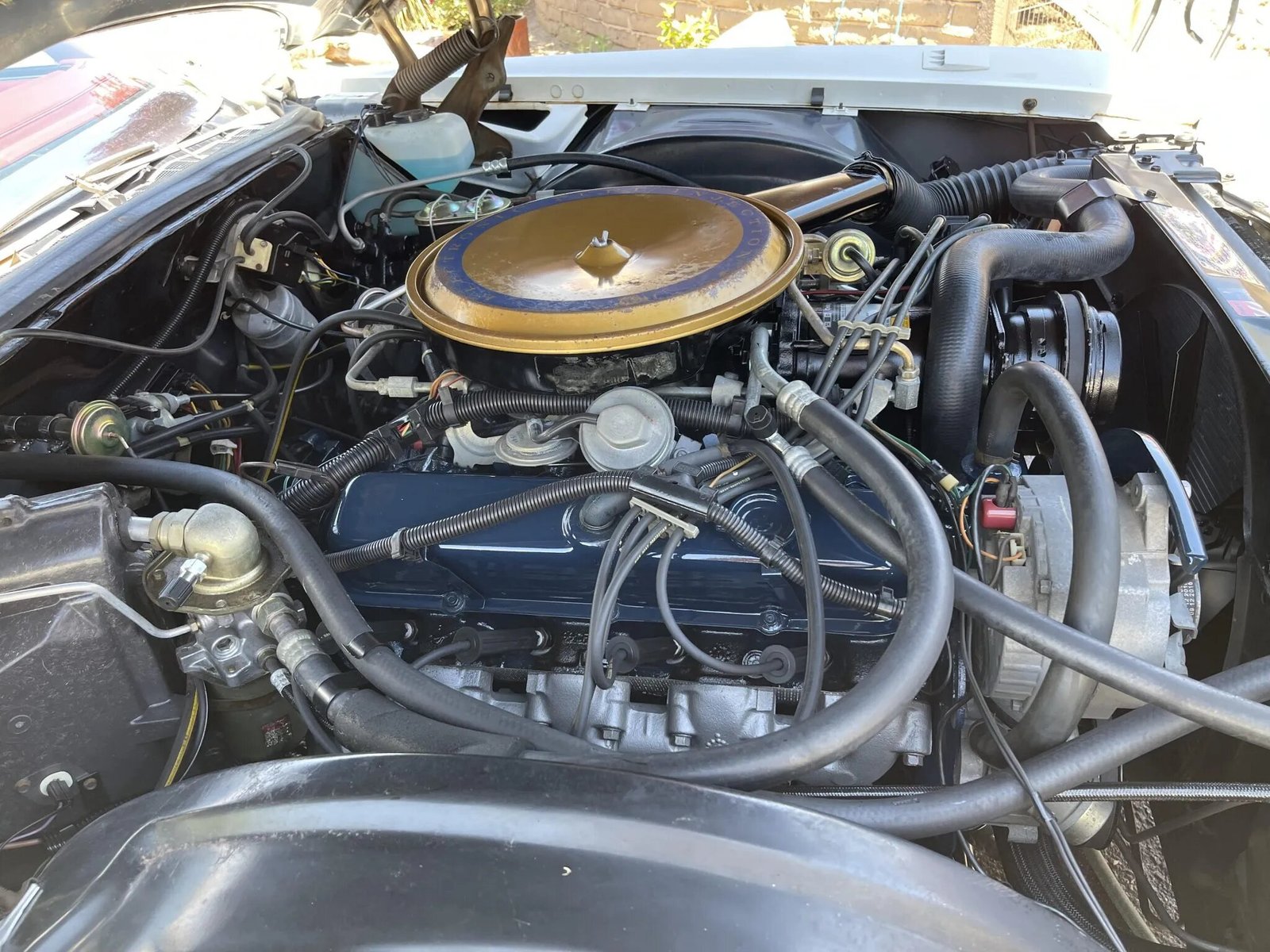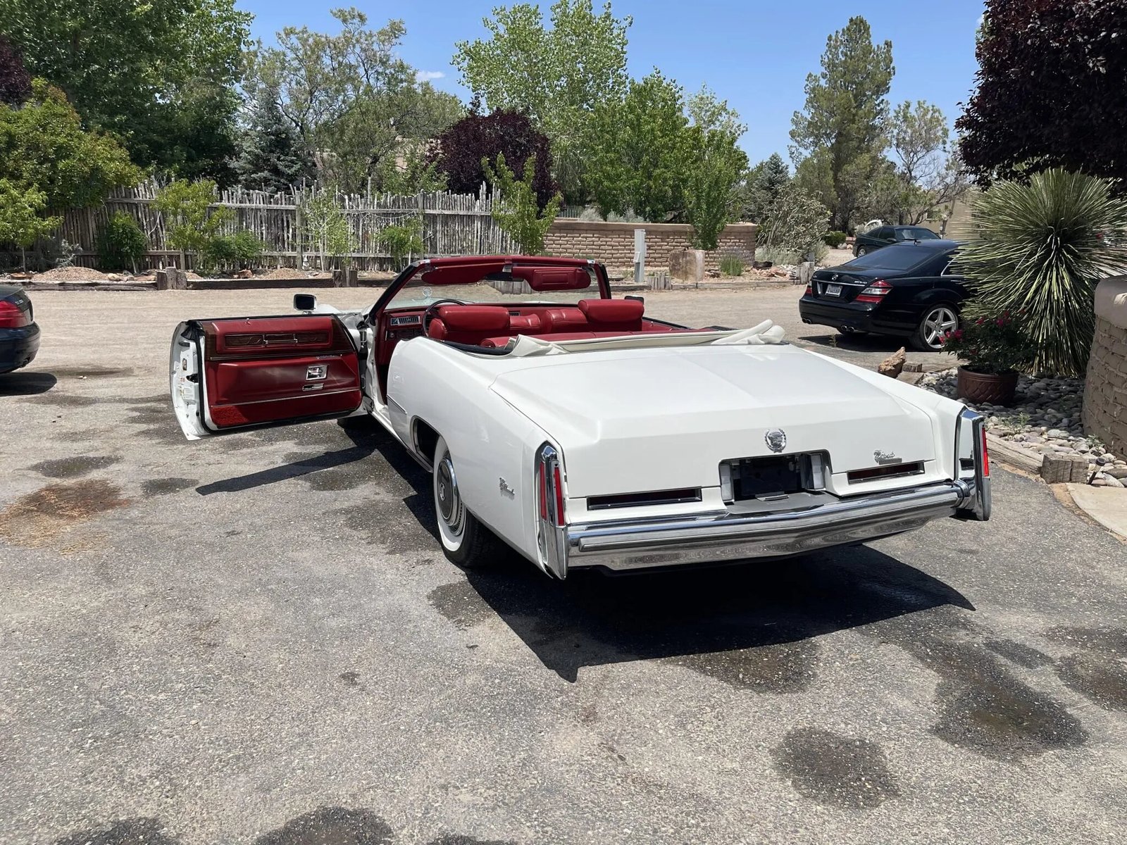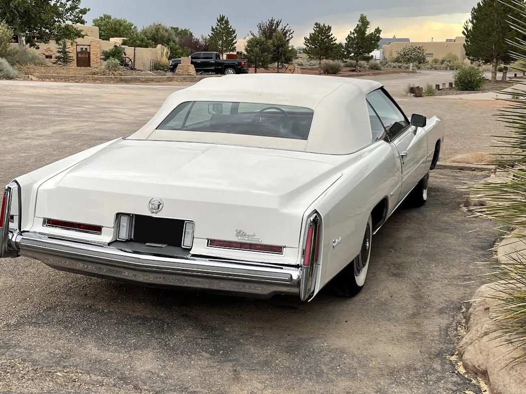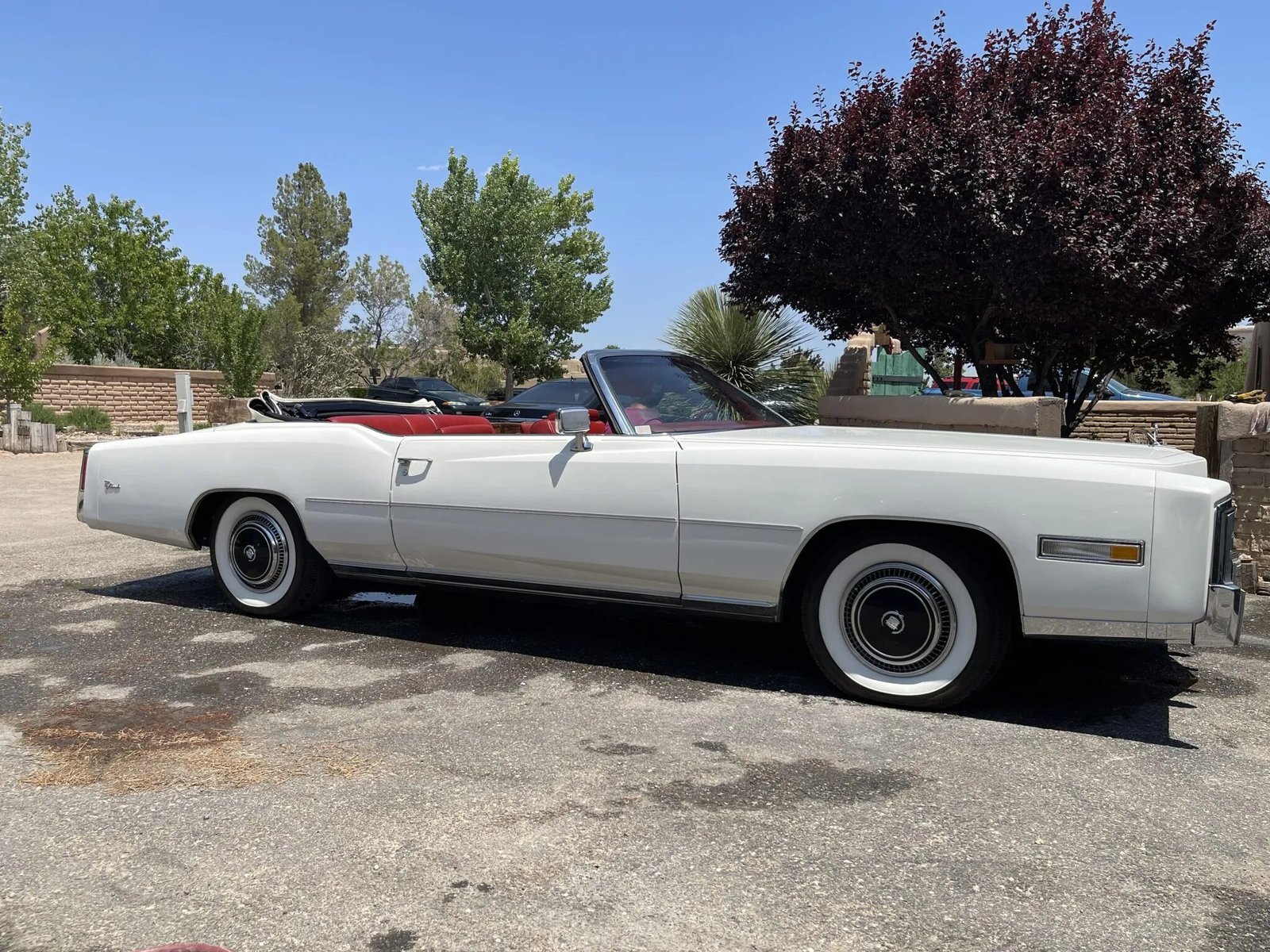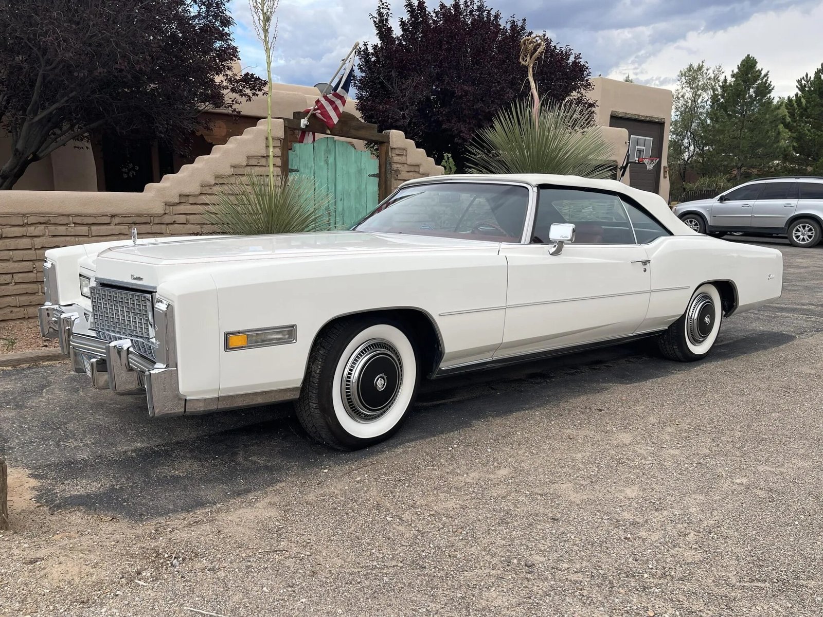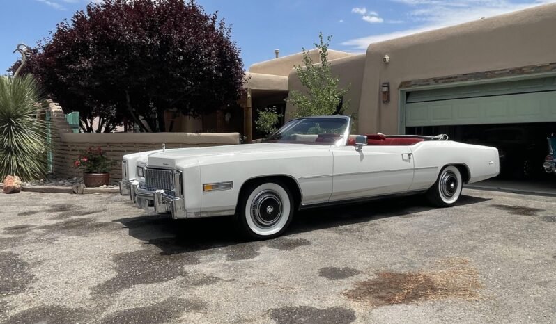This 1976 Cadillac Eldorado convertible is powered by an 8.2-liter V8 paired with a three-speed automatic transmission and is finished in Cotillion White over Antique Dark Firethorn Sierra Grain leather. Equipment includes a white soft top, 15″ steel wheels, black wheel covers, four-wheel disc brakes, Twilight Sentinal automatic headlights, and an AM/FM stereo with an eight-track cassette player as well as a rear window defroster, automatic climate control, power windows, and a power-adjustable front bench.