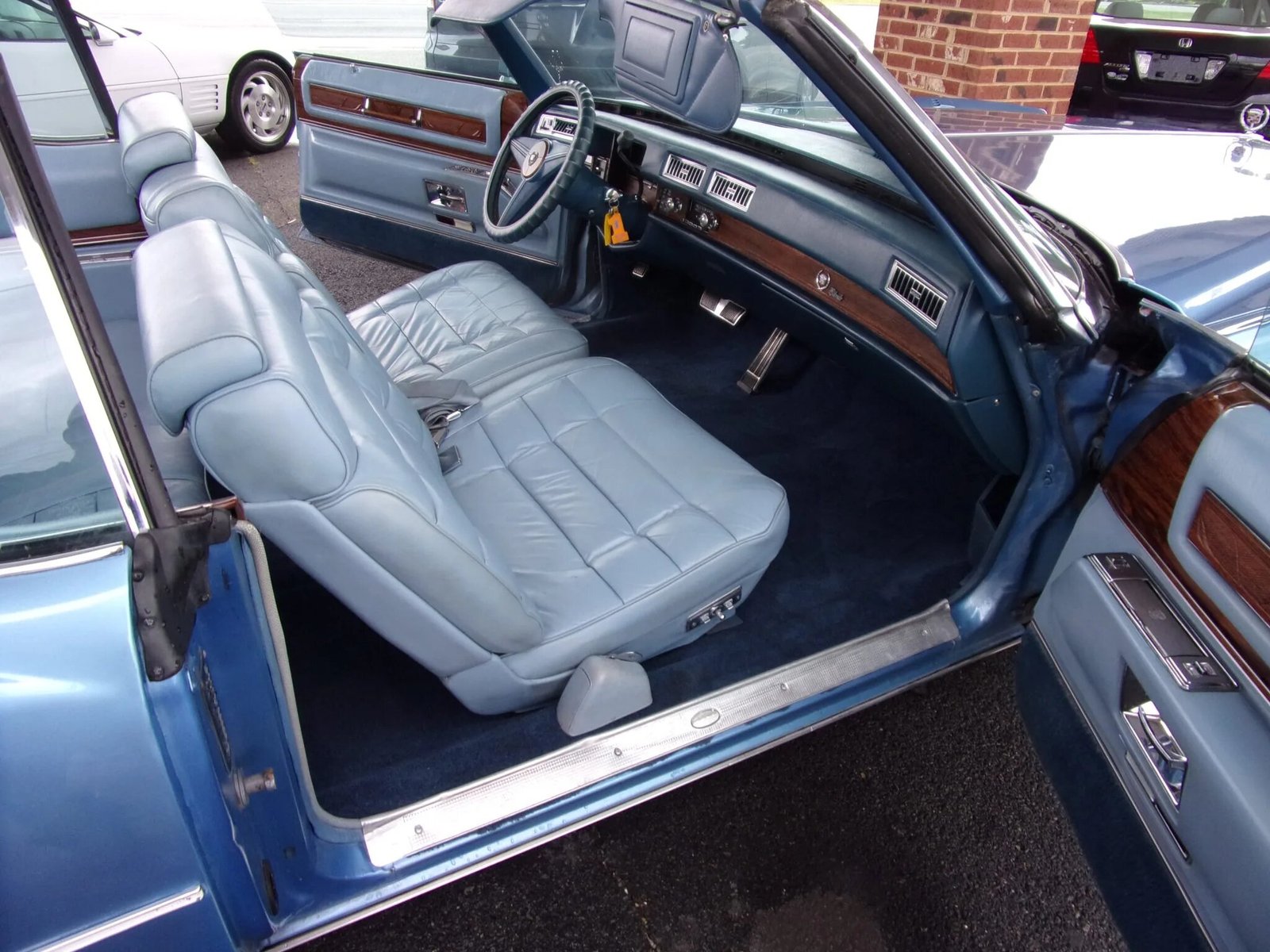 The seats are trimmed in light blue leather upholstery and are complemented by a matching dashboard, door panels, and darker carpets.
