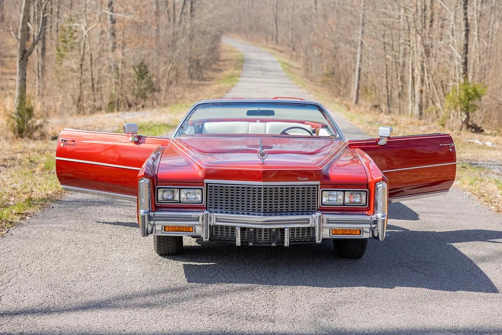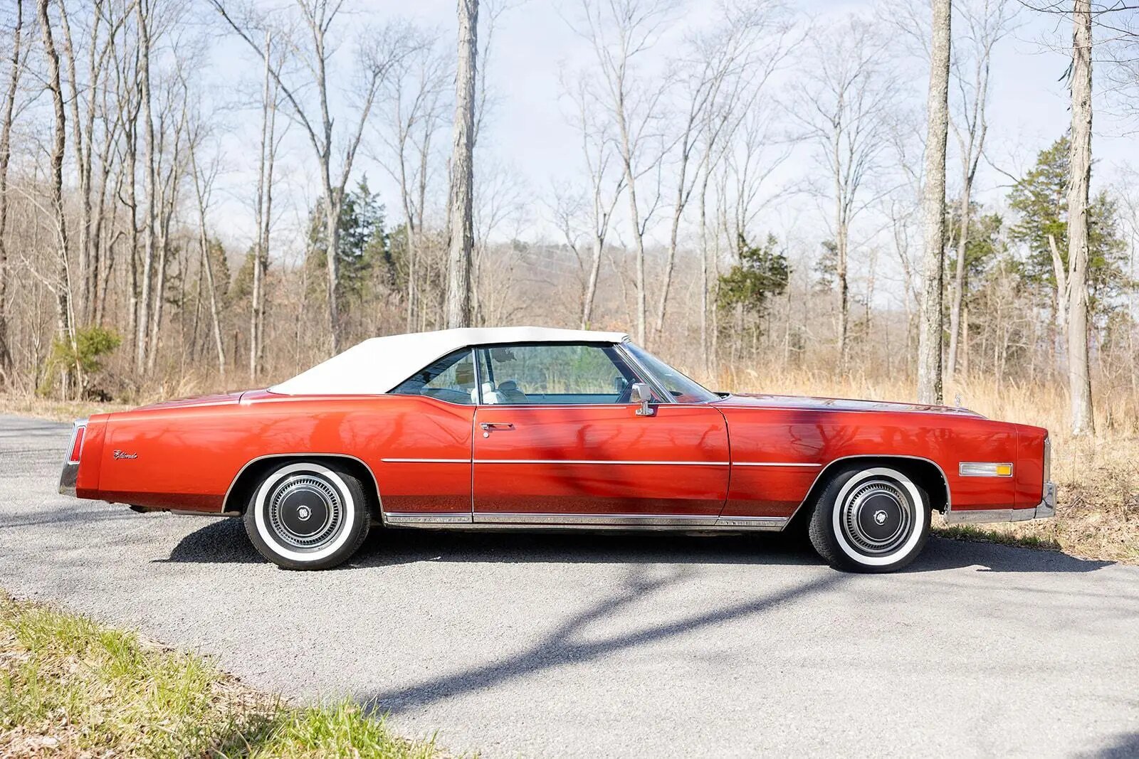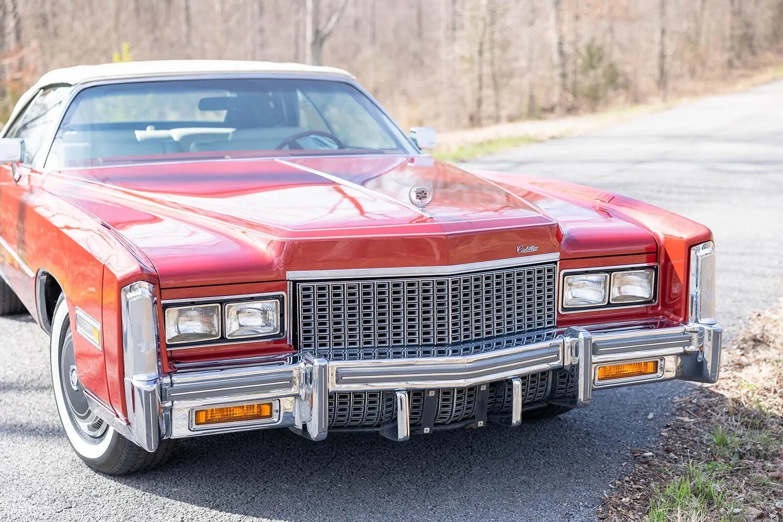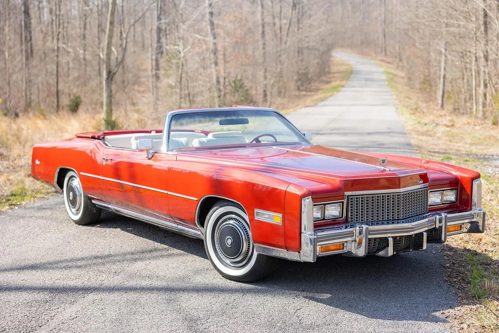 This 1976 Cadillac Eldorado convertible is finished in Firethorn Metallic red over white leather upholstery and is powered by a 500ci V8 paired with a three-speed automatic transaxle.