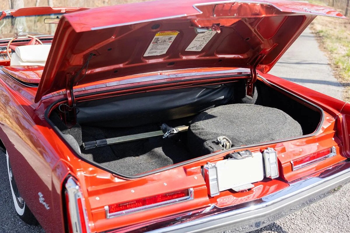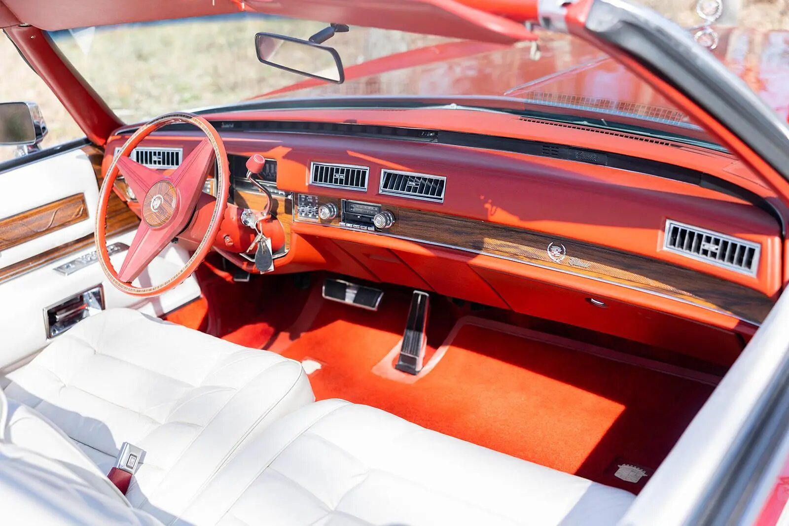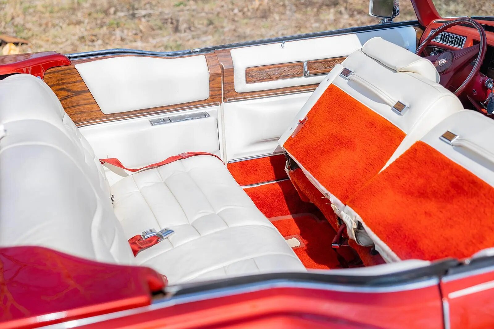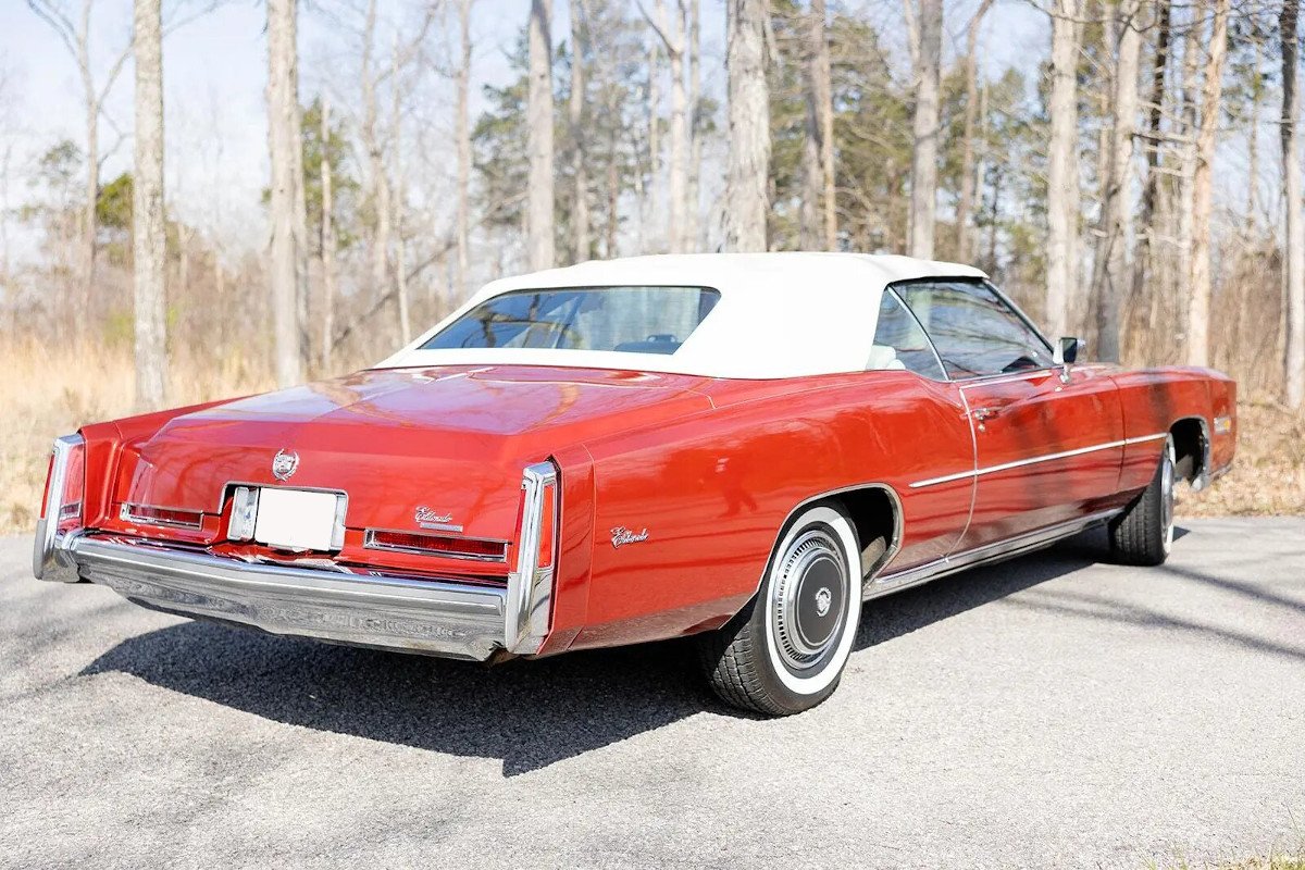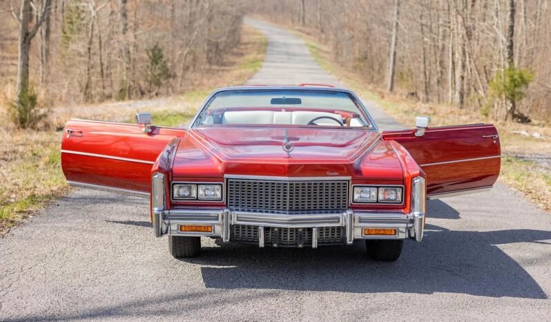 This 1976 Cadillac Eldorado convertible is finished in Firethorn Metallic red over white leather upholstery and is powered by a 500ci V8 paired with a three-speed automatic transaxle.