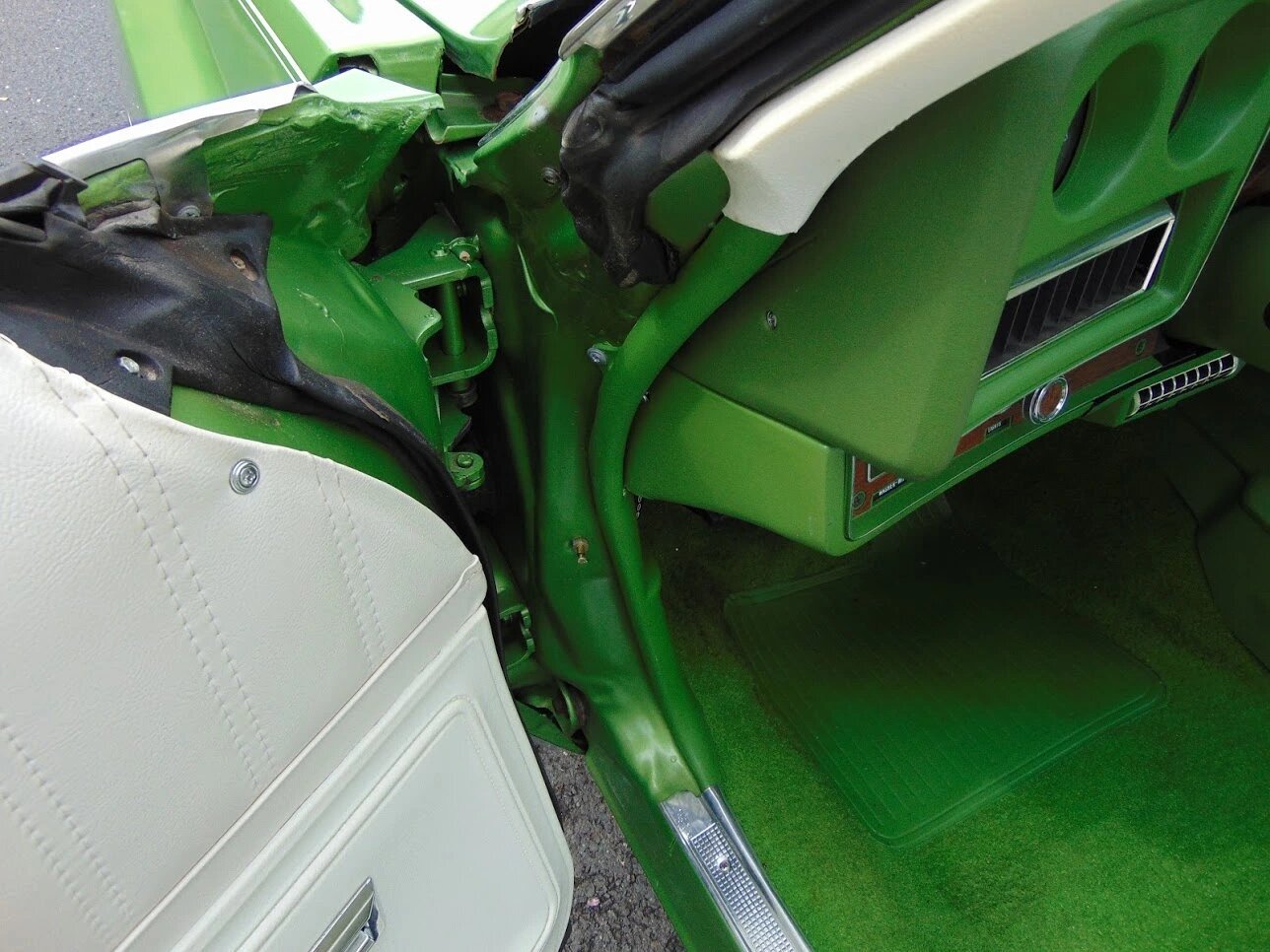 It is finished in Lime Green Metallic, and the Dark Lime interior features swing-out front bucket seats upholstered in white vinyl.