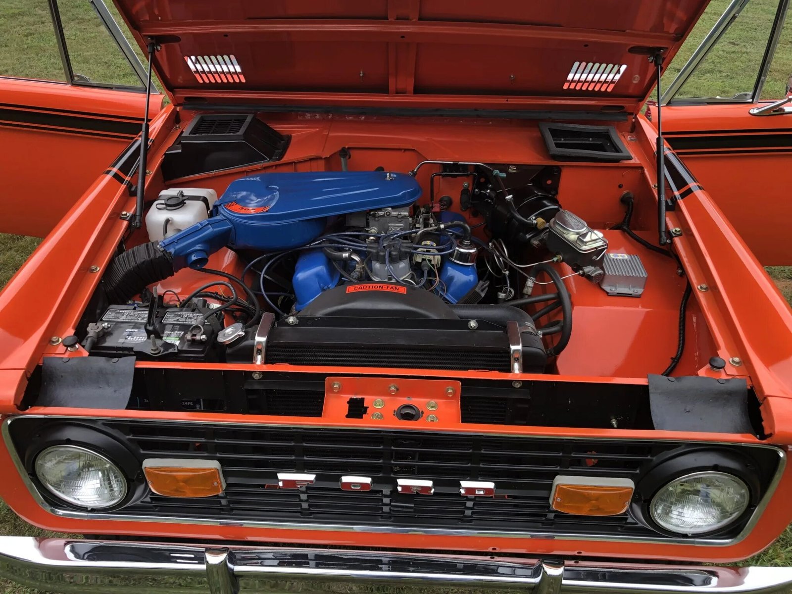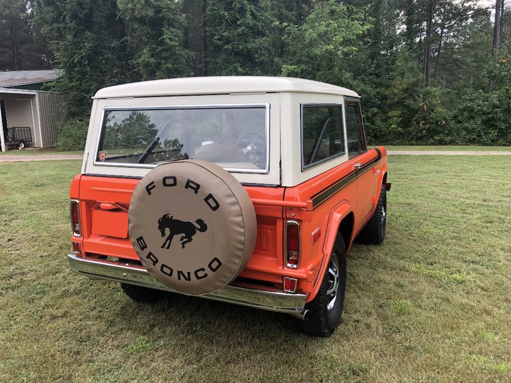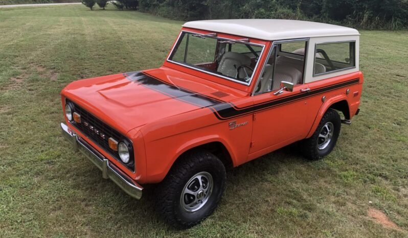 Power is supplied by a 302ci V8 mated to a three-speed automatic transmission and a dual-range transfer case, and equipment includes black side stripes, a removable white hardtop, a roll bar, power steering, fender flares, and a Grant steering wheel.