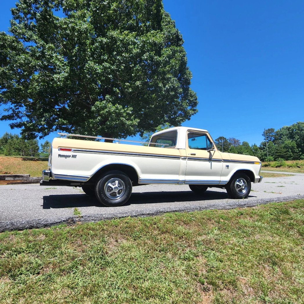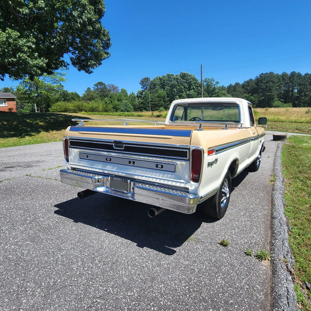 This 1976 Ford F-100 Ranger XLT is a regular cab pickup that is finished in tan and white over tan upholstery and is powered by a replacement 427ci V8 mated to a C6 automatic transmission and a 9-inch limited-slip differential with 4.11:1 gearing.