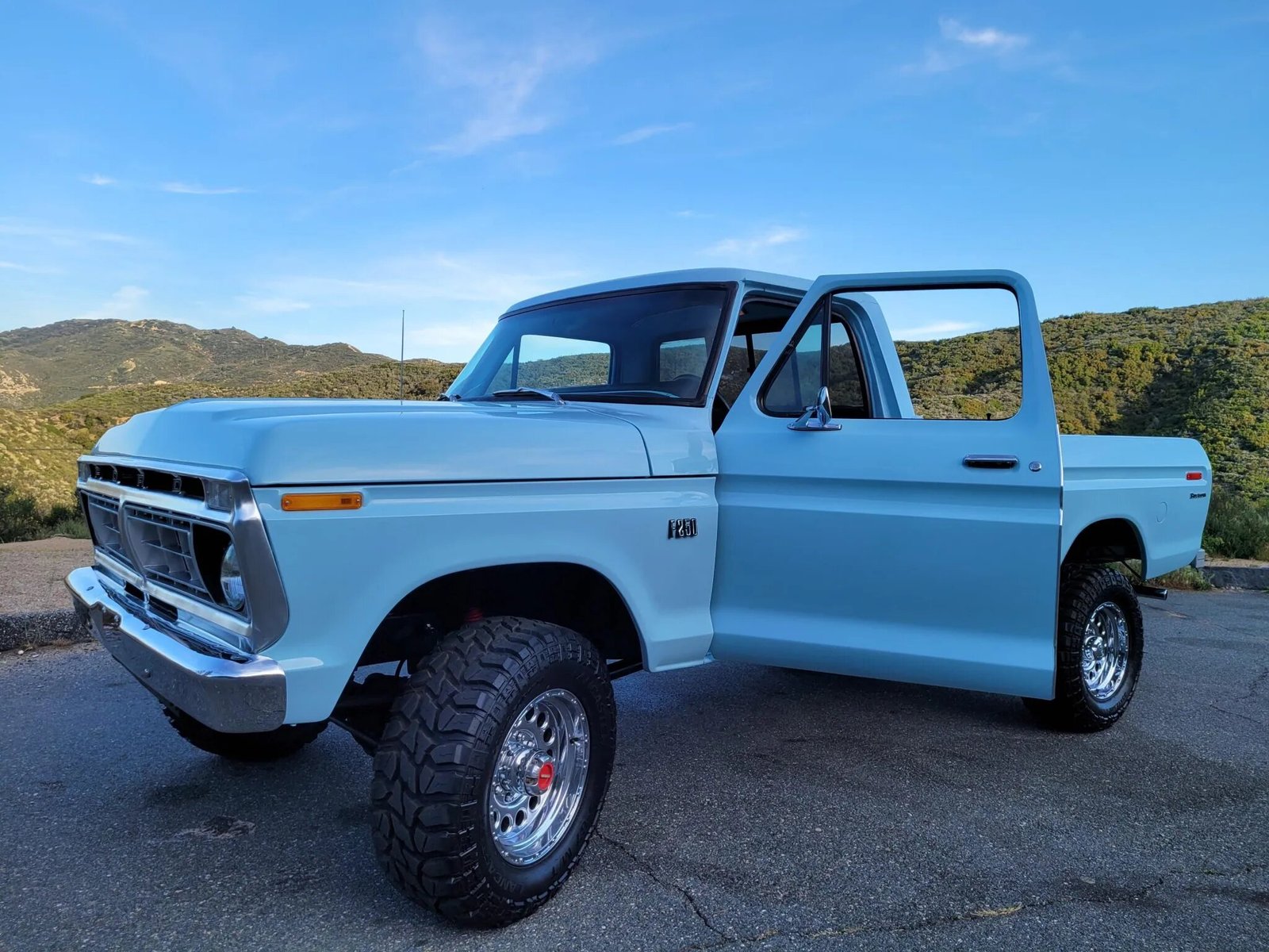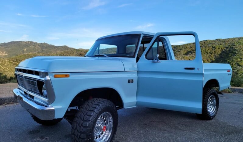 This 1976 Ford F-250 Custom was fitted with a 390ci V8 and repainted in blue over black cloth upholstery. Equipment includes a four-speed manual transmission, a dual-range transfer case, a Carter four-barrel carburetor, a dual exhaust system, a sliding rear window, dual fuel tanks, chrome 17″ wheels, Skyjacker shocks, power steering, a multimedia stereo, an aftermarket steering wheel, and a receiver hitch.