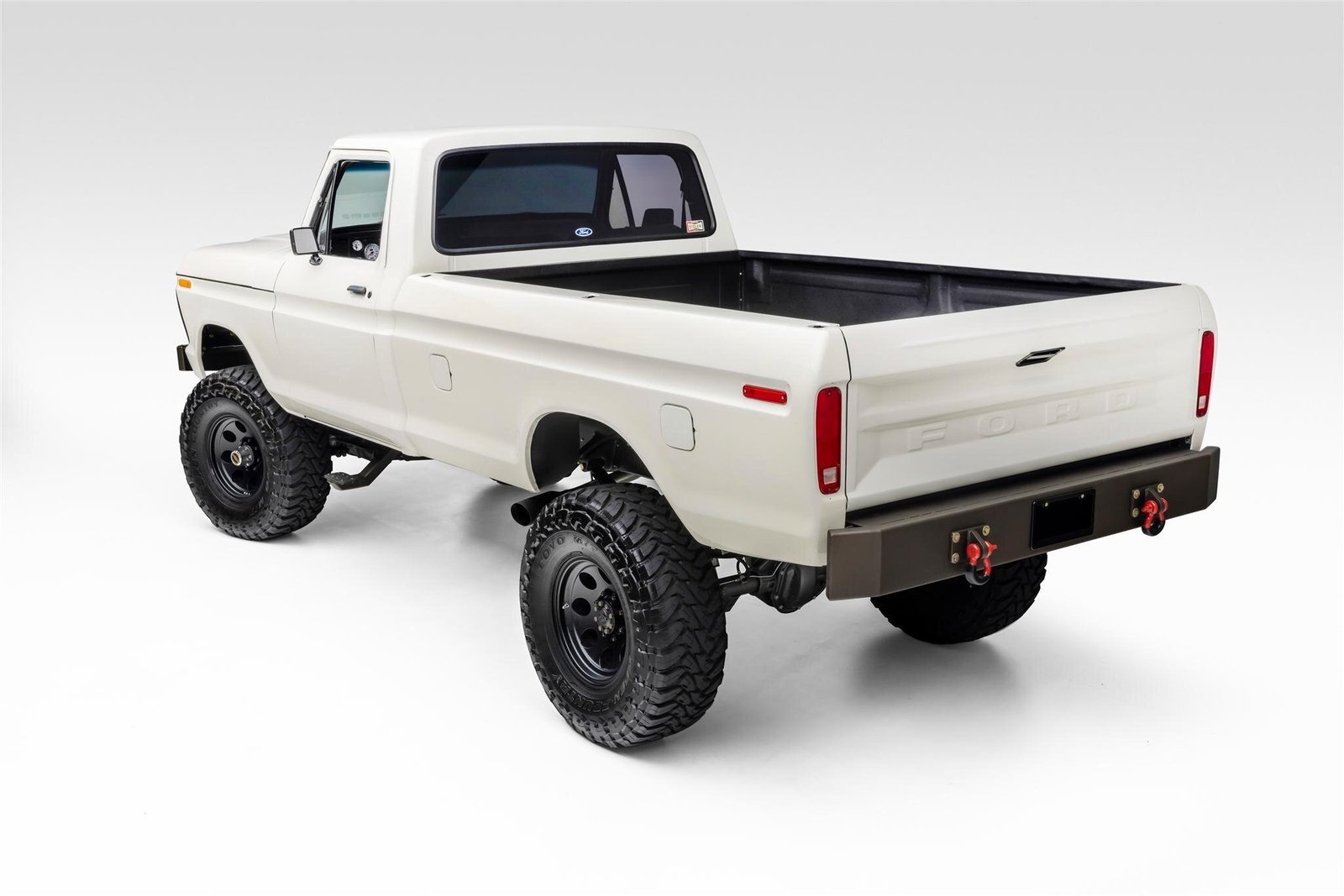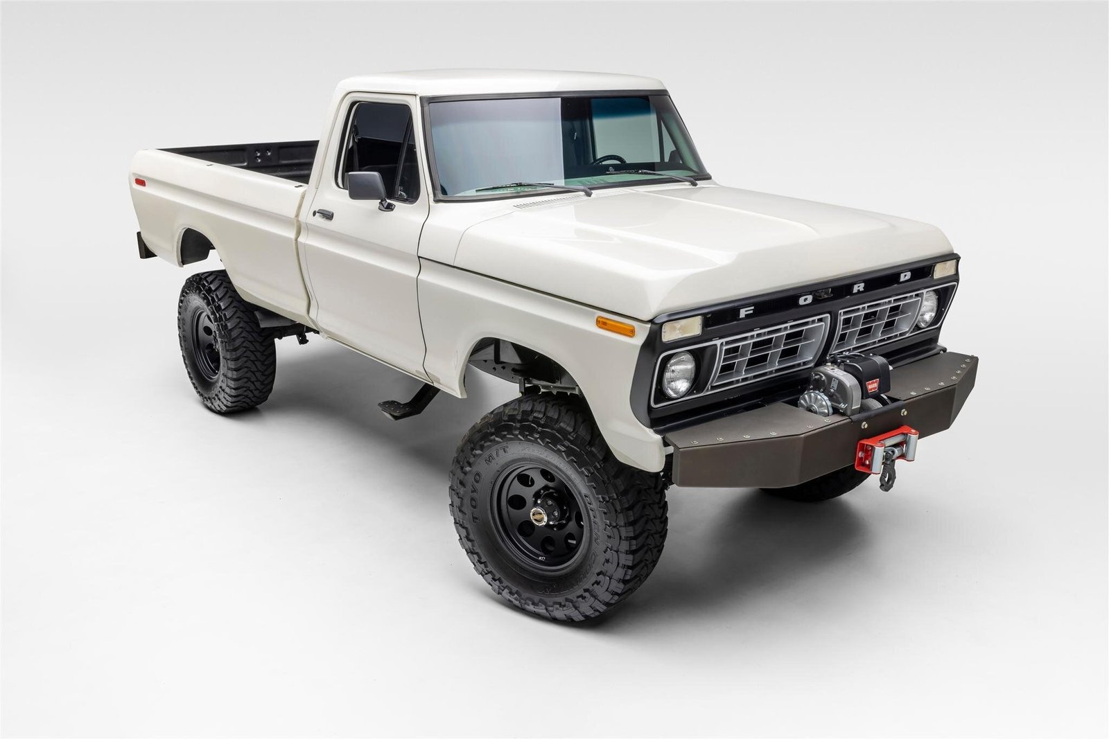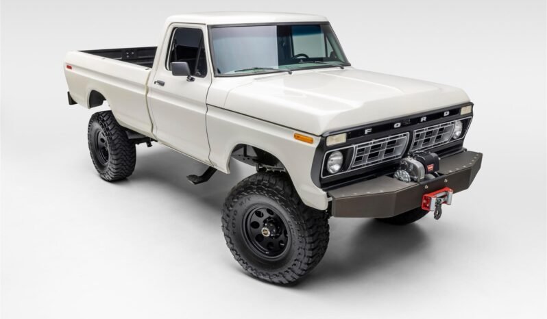 This 1976 Ford F-250 is a regular-cab long-bed pickup, work included refinishing the body in white, retrimming the interior, powder coating the frame and Dana 44 axles, and rebuilding the 390ci V8, four-speed manual transmission, and dual-range transfer case. Additional modifications include a suspension lift with Fox shocks, 18″ wheels with 35″ Toyo tires, power-assisted four-wheel disc brakes, power steering, ProLine Fabrication bumpers, side exhaust outlets, a WARN winch, manually locking front hubs, AutoMeter NV gauges, and a Kenwood stereo receiver.
